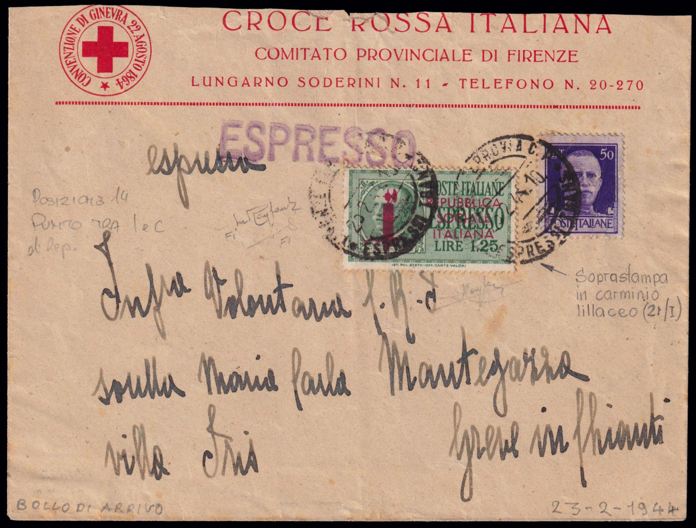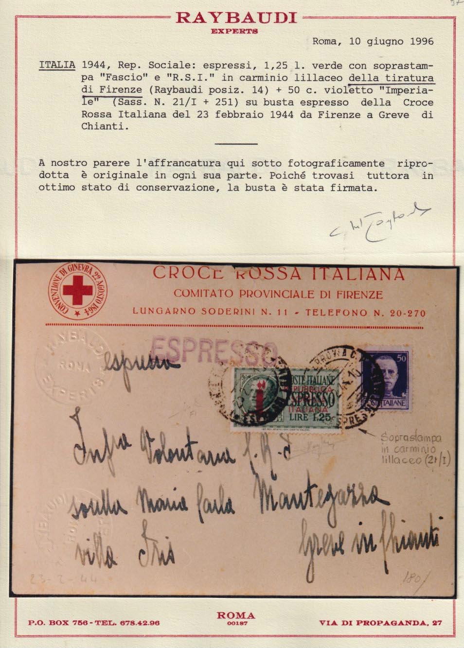 136 L imageESPRESSO TIRATURA DI FIRENZE. Lettera espesso spedita da Firenze per Greve di Chianti il 23/2/44 ed affrancata con un francobollo da 50 centesimi Imperiale ed il raro espresso da lire 1,25 con soprastampa carminio lillaceo caratteristica della posizione 14 del foglio di 50 (punto fra I e C di REPUBBLICA). Timbro di arrivo al retro. Dettagliato certificato Raybaudi (1996). Insieme di gran pregio impreziosito dalla plattatura. (Image) (ImageA) (ImageB)