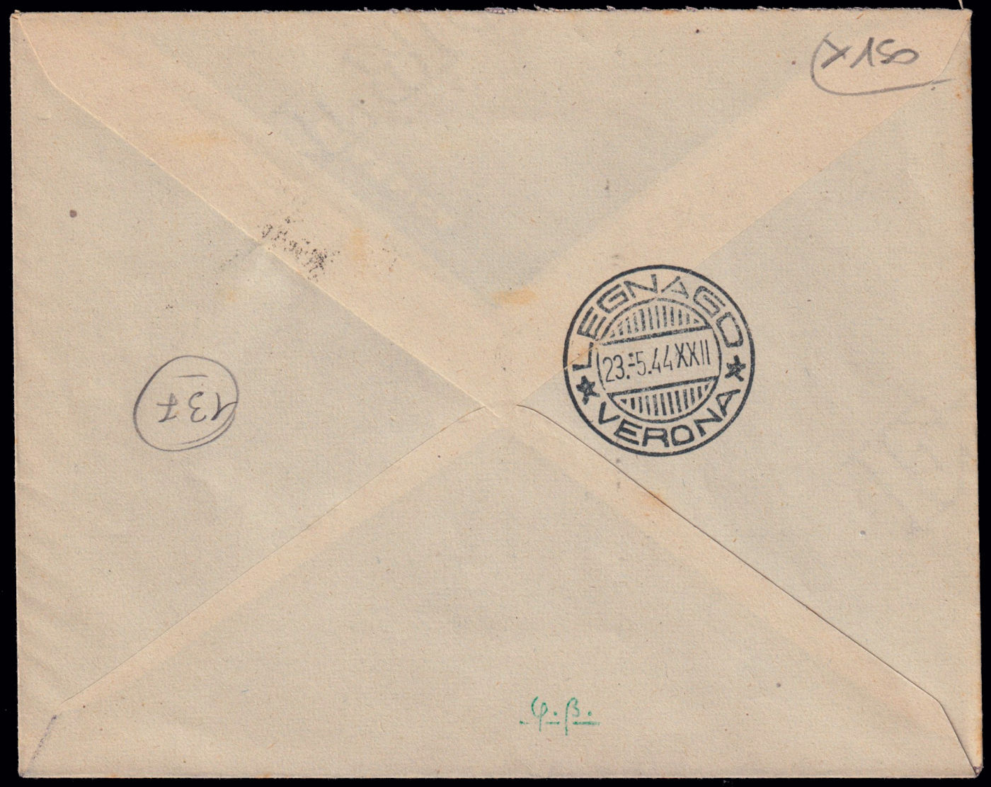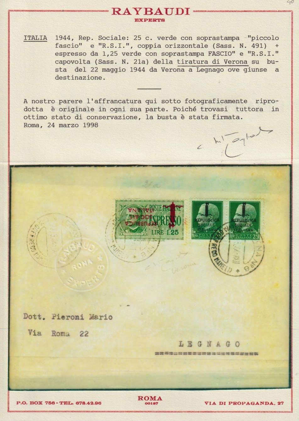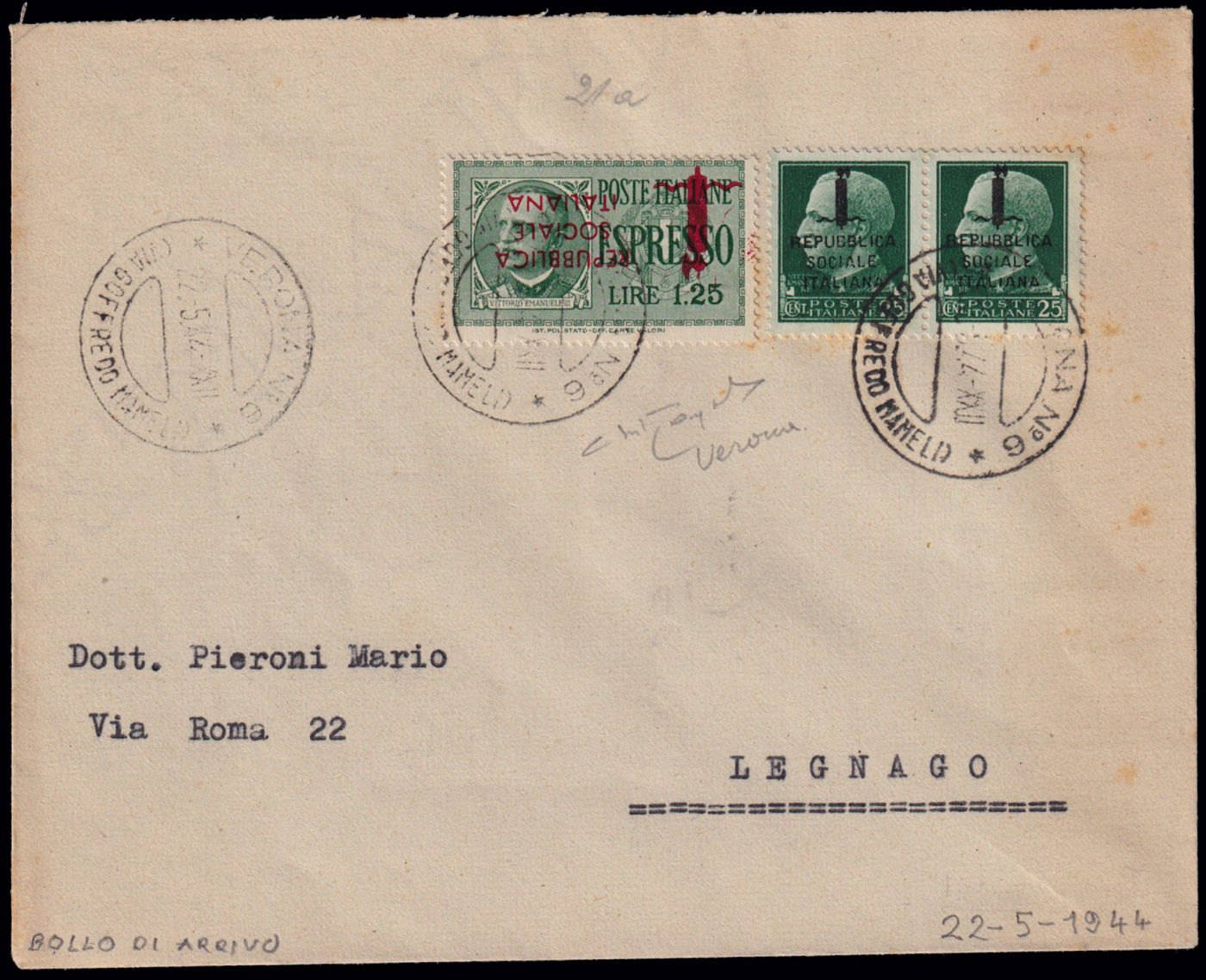 137 L imageSOPRASTAMPA CAPOVOLTA. Lettera spedita da Verona per Legnago il 22/5/44 ed affrancata con coppia orizzontale del francobollo da 25 centesimi ed esemplare espresso da lire 1,25 con la varietà di soprastampa della tiratura di Verona. Timbro di arrivo al retro. Dettagliato certificato Raybaudi (1998). (Image) (ImageA) (ImageB)