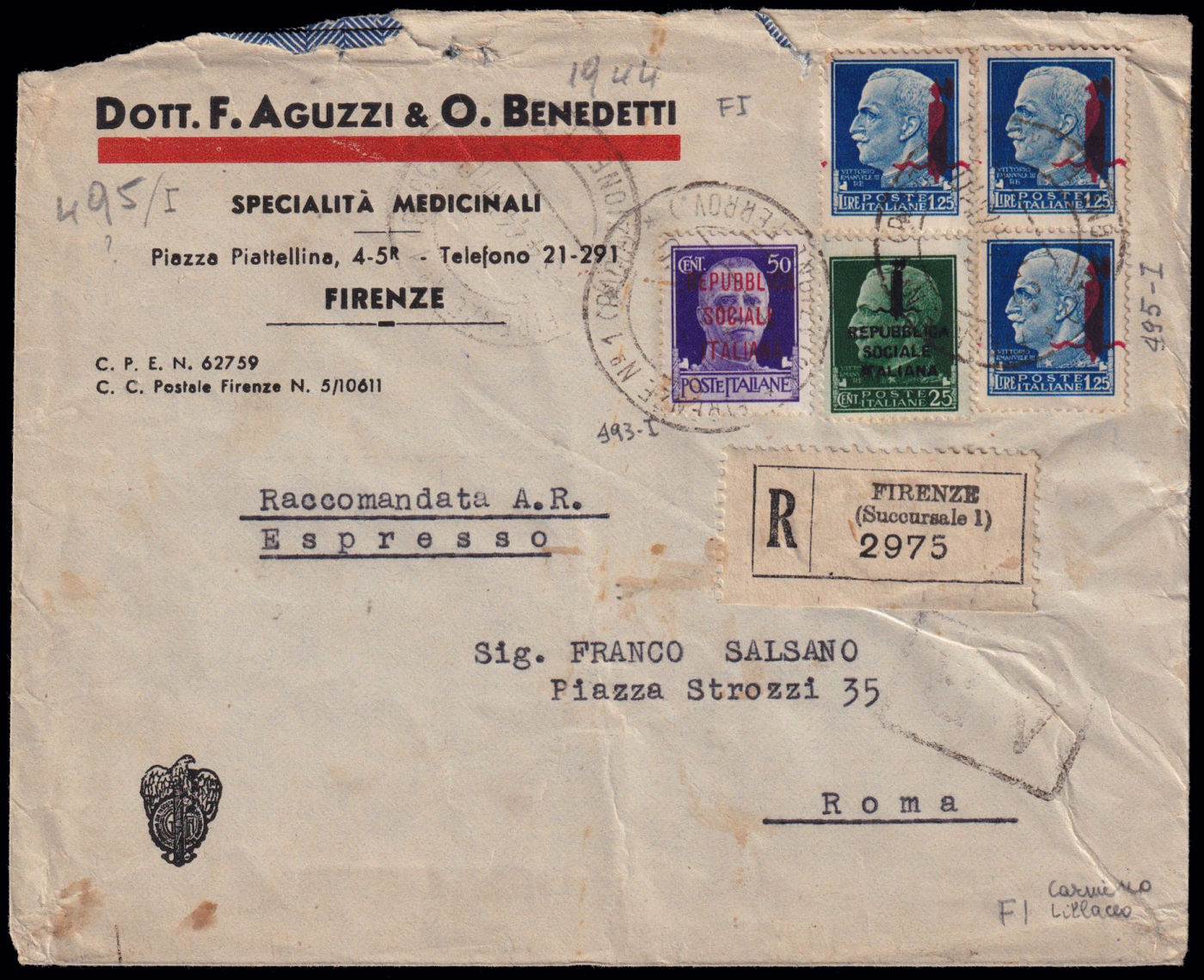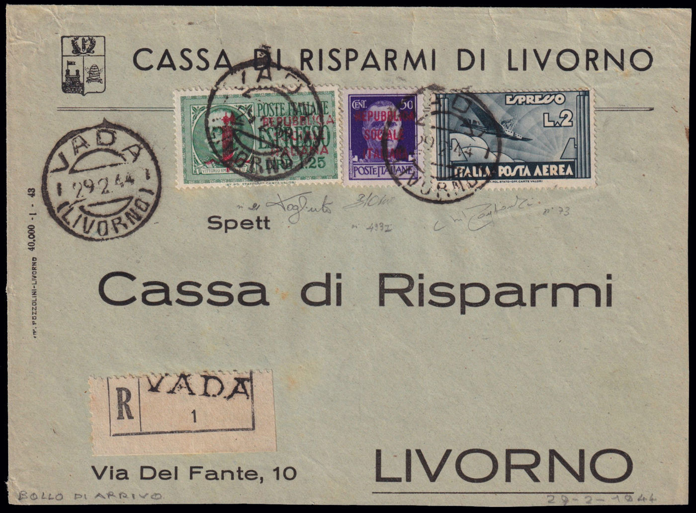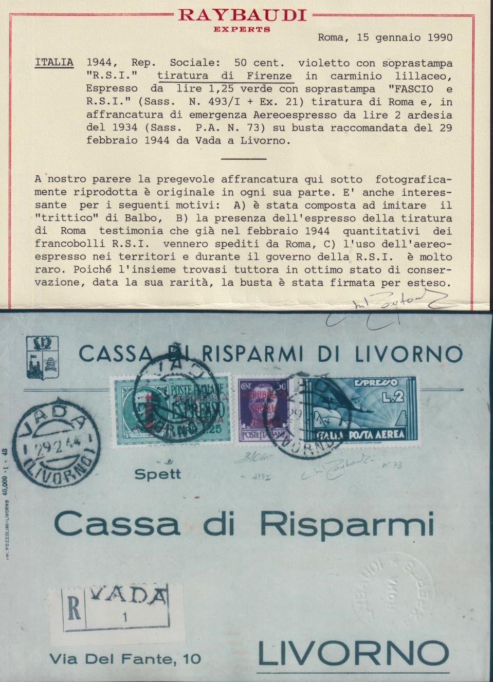 139 L imageAEROESPRESSO DEL REGNO D'ITALIA. Busta raccomandata spedita da Vada per Livorno il 29/2/44 ed affrancata con rarissima combinazione composta a "guisa" del trittico della Crociera del Decennale con un francobollo espresso da lire 1,25 della tiratura di Roma (testimonianza che già dal febbraio '44 quantitativi di francobolli vennero spediti da Roma alle varie direzioni postali del nord Italia), un francobollo da 50 centesimi con soprastampa RSI carminio lillaceo della tiratura di Firenze ed il francobollo da 2 lire aeroespresso aedesia del 1934. Timbro di arrivo al retro. Dettagliato certificato Raybaudi (1990). Unica. (Image) (ImageA) (ImageB)
