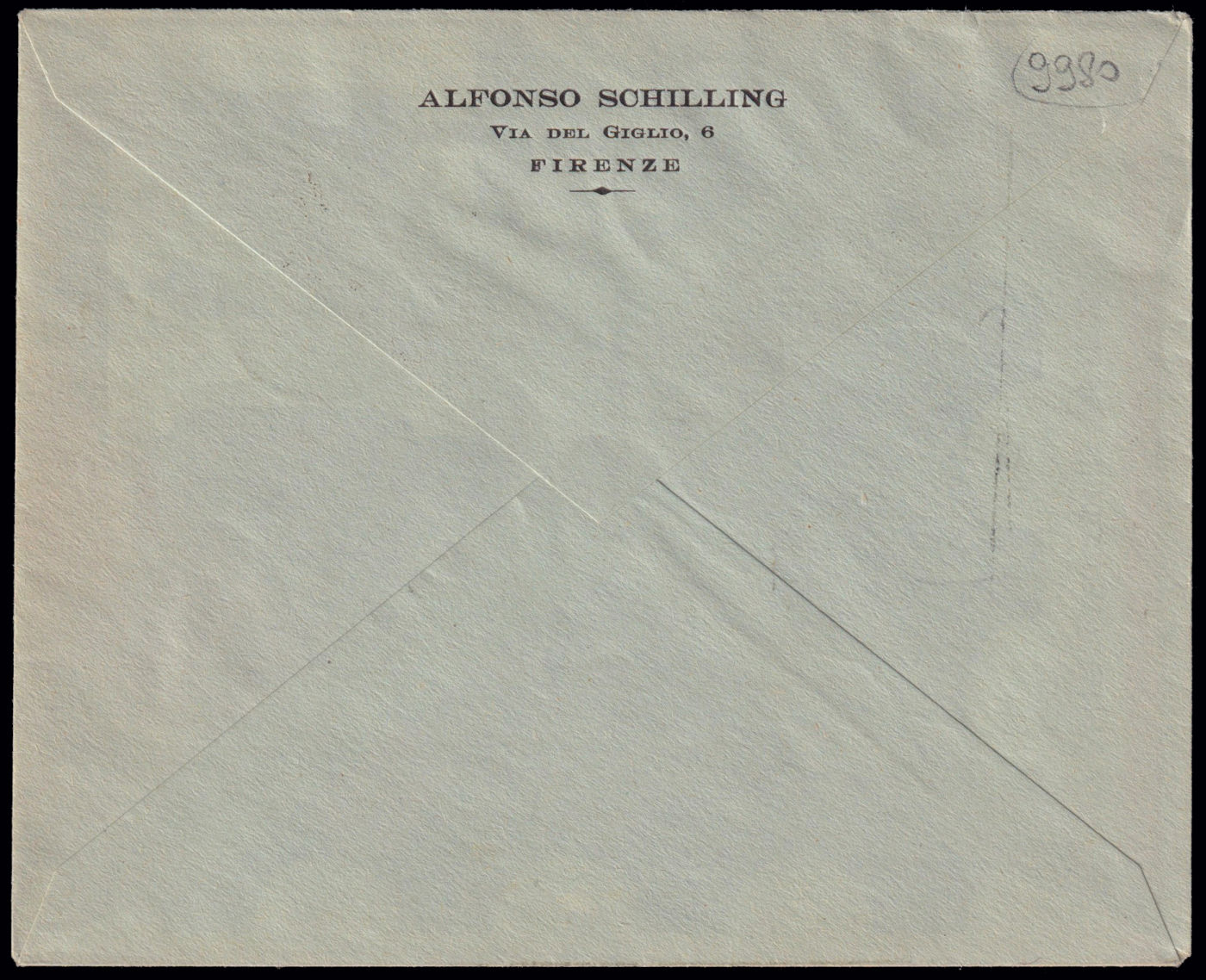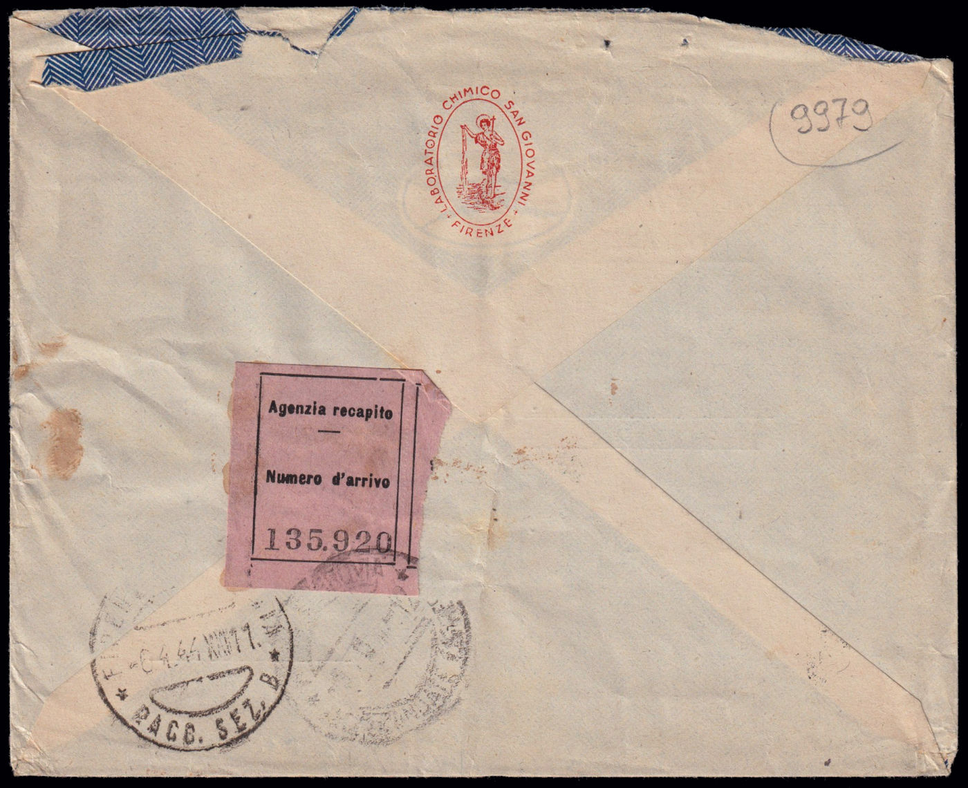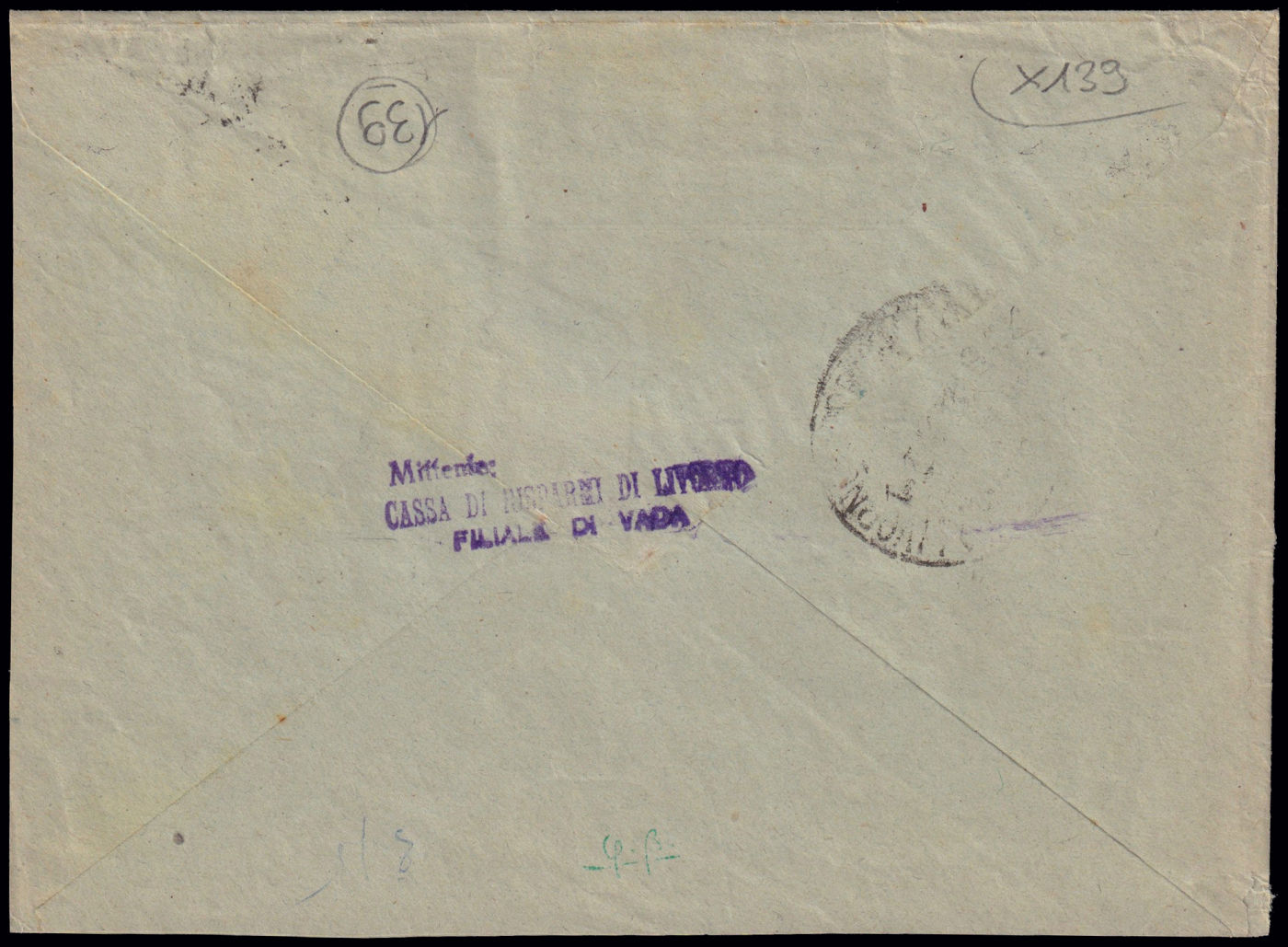 139 L imageAEROESPRESSO DEL REGNO D'ITALIA. Busta raccomandata spedita da Vada per Livorno il 29/2/44 ed affrancata con rarissima combinazione composta a "guisa" del trittico della Crociera del Decennale con un francobollo espresso da lire 1,25 della tiratura di Roma (testimonianza che già dal febbraio '44 quantitativi di francobolli vennero spediti da Roma alle varie direzioni postali del nord Italia), un francobollo da 50 centesimi con soprastampa RSI carminio lillaceo della tiratura di Firenze ed il francobollo da 2 lire aeroespresso aedesia del 1934. Timbro di arrivo al retro. Dettagliato certificato Raybaudi (1990). Unica. (Image) (ImageA) (ImageB)