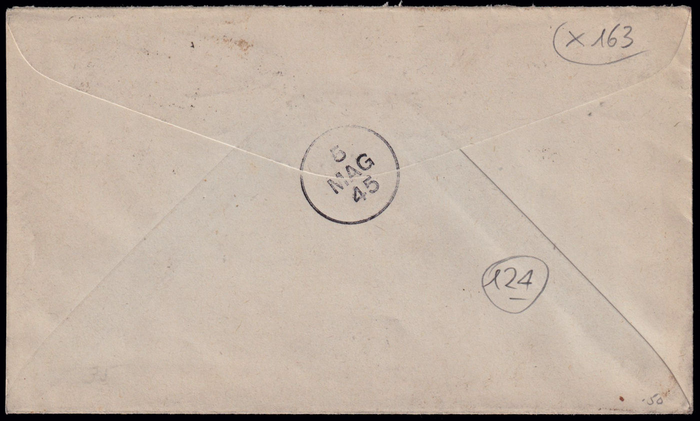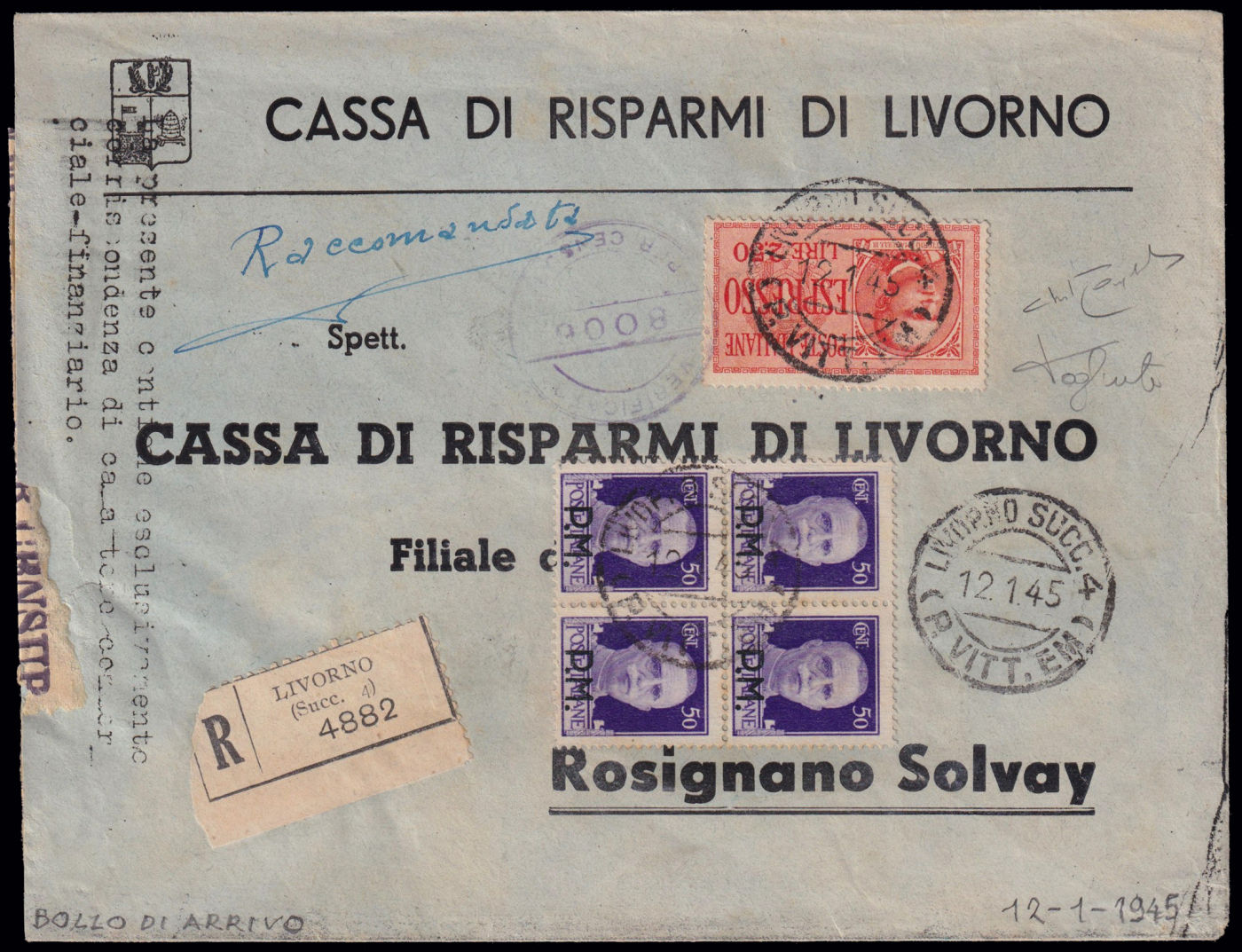 140 L imageAFFRANCATURA DI EMERGENZA. Lettera raccomandata spedita da Livorno per Rosignano il 12.1.1945 affrancata con quartina del francobollo da 50 centesimi soprastampato PM ed espresso da lire 2,50 per assolvere alla tariffa di raccomandazione in vigore dal 1.10.1944 nei territori del Regno d'Italia. Rarissimo uso del francobollo espresso come ordinario in periodo di RSI nei territori occupati dalle truppe alleate. Timbro di arrivo al retro. Firma di garanzia Raybaudi. (Image) (ImageA)