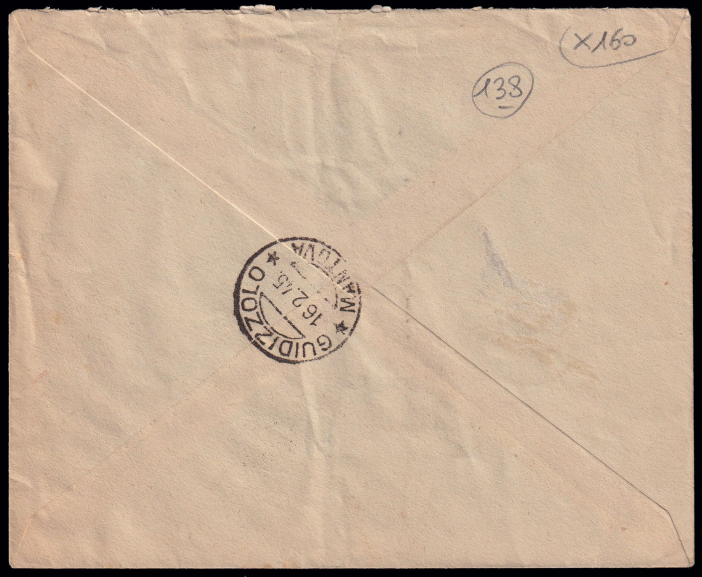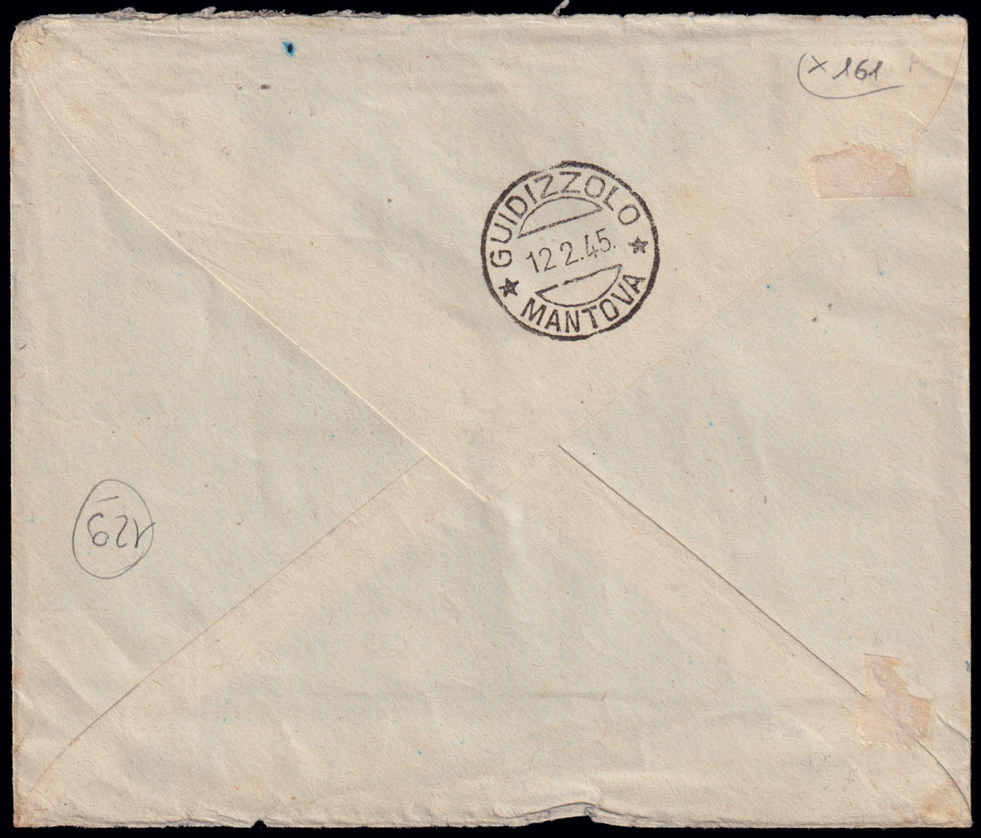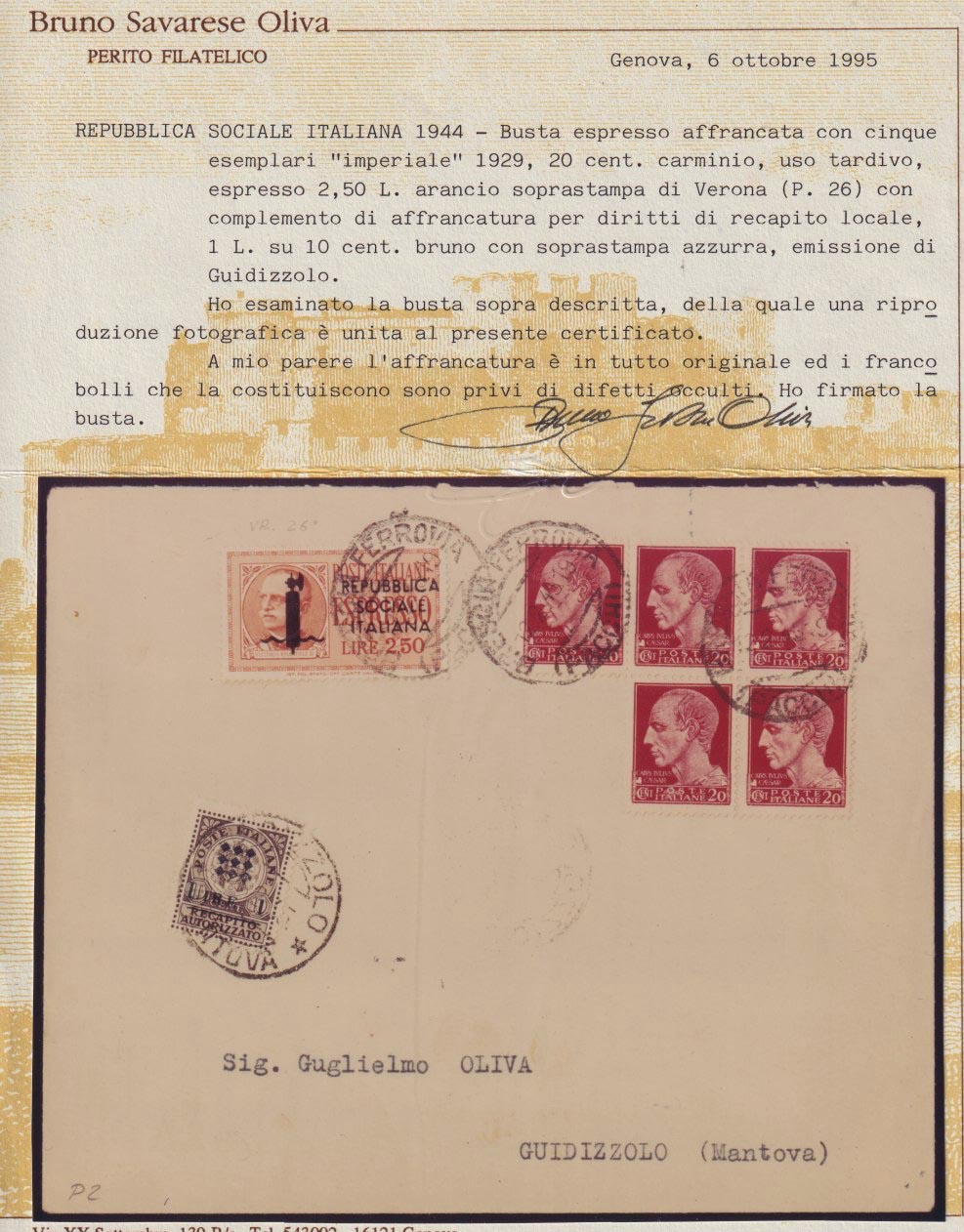 138 L imageESPRESSO PER L'INTERNO II PERIODO TARIFFARIO. Busta primo porto espresso spedita da Brescia per Guidizzolo il 12/2/1945 affrancata con 5 francobolli Imperiale da 20 centesimi e dal raro espresso da lire 2,50 soprastampato RSI della tiratura di Verona. In arrivo venne applicato il segnatasse da 1 lira per il recapito locale a Guidizzolo annullato in data 16/2/45. Timbro di arrivo al retro. Insieme raro ed in perfetta tariffa. Dettagliato certificato Savarese-Oliva (1995). (Image) (ImageA) (ImageB)