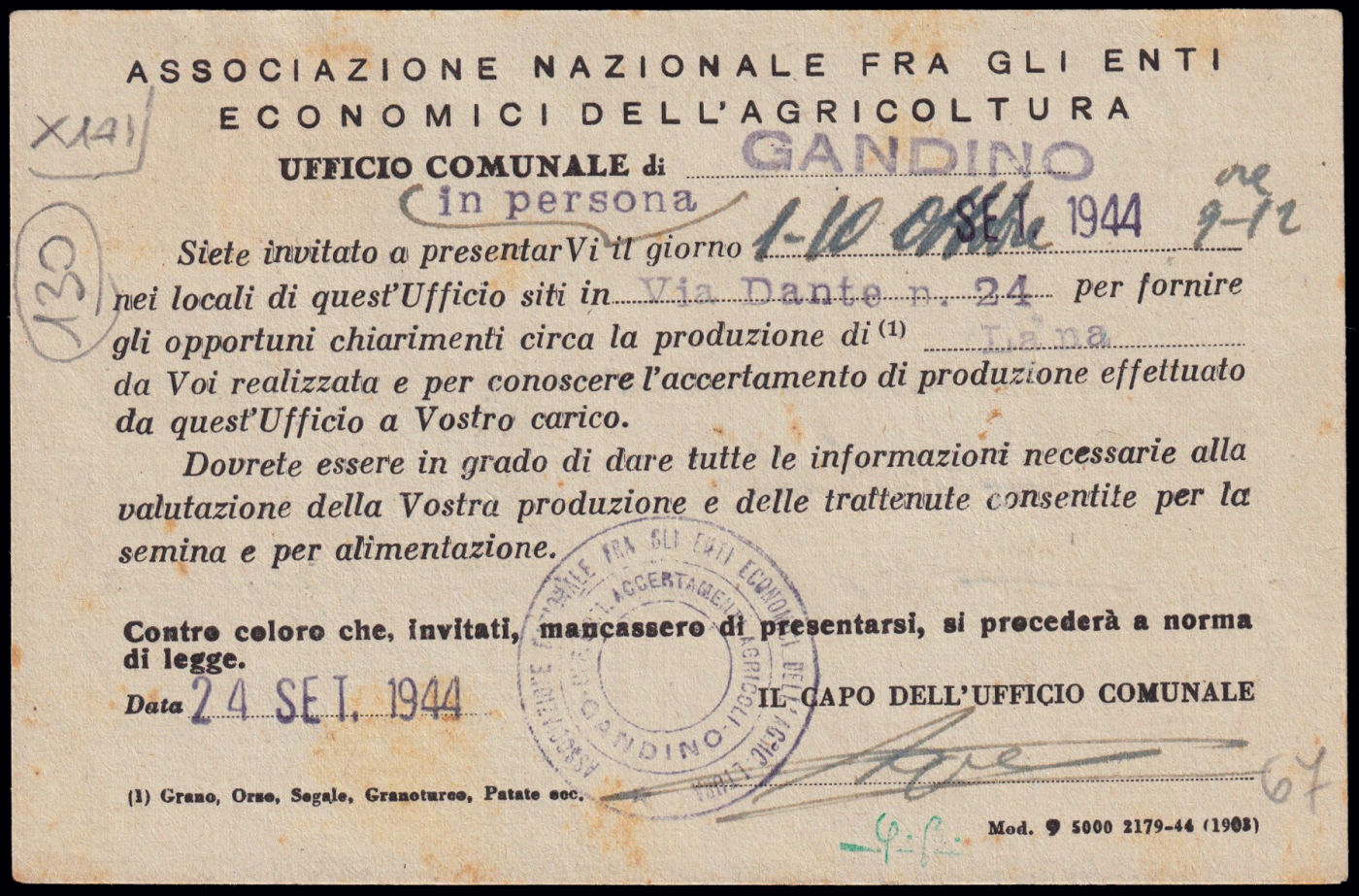 130 imageFRAZIONATO DI GANDINO NELl?ULTIMO GIORNO TARIFFARIO. Cartolina affrancata con coppia del francobollo da 10 centesimi Mon. Distrutti con l'esemplare di sinistra frazionato diagonalmente (inferiore destra), annullati "Gandino 30/9/44". Raro con firma di garanzia L. Raybaudi. (Image) (ImageA)