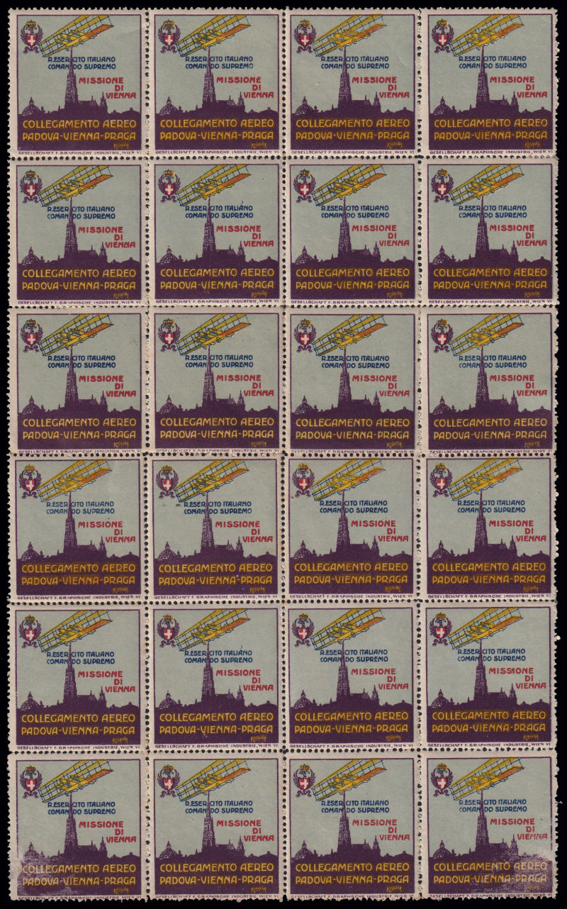 1919 VIENNA - PADOVA COLLEGAMENTO POSTALE AEREO. Blocco di 24 vignette policrome "Missione di Vienna", dentellate e gommate. Longhi 1002. Riprodotto a pagina 333 del Catalogo "Aerofilia Italiana" di F.Longhi, nuova