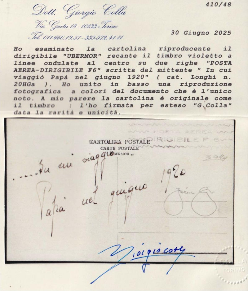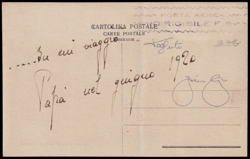 manoscritto "in cui viaggiò Papà nel giugno 1920". Longhi 1156. Riprodotta a colori a pagina 191 del Catalogo "Aerofilia Italiana" di F. Longhi. Unica nota. Dettagliato certificato G. Colla (2025). (Image) (ImageA)