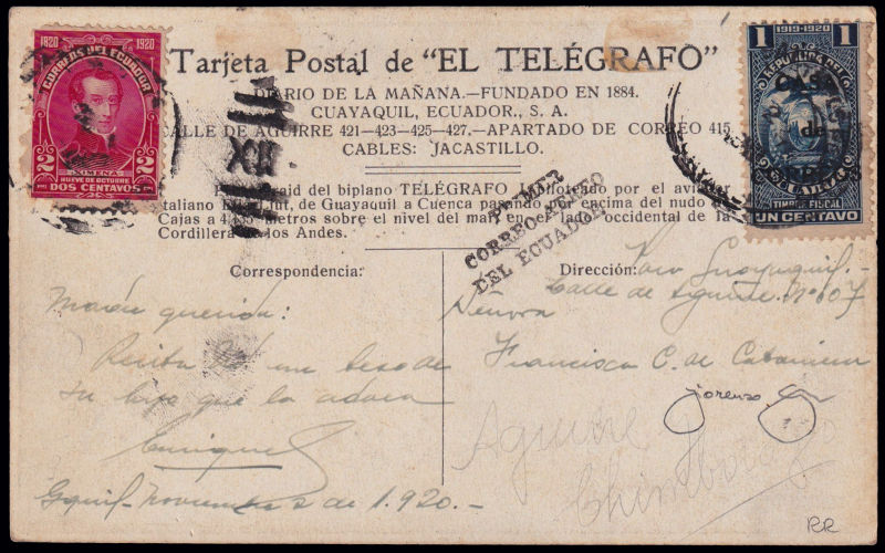 1920 EQUADOR PRIMO VOLO GUAYAQUIL - CUENCA. Cartolina speciale del velivolo "El Telegrafo I°" affrancata con due francobolli di Equador annullati in data 2 novembre 1920 e timbro speciale su 3 righe a lato "PRIMER