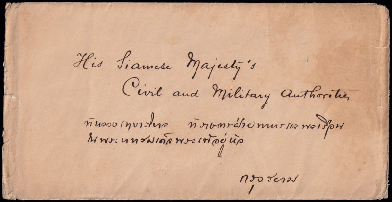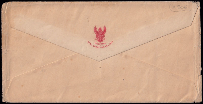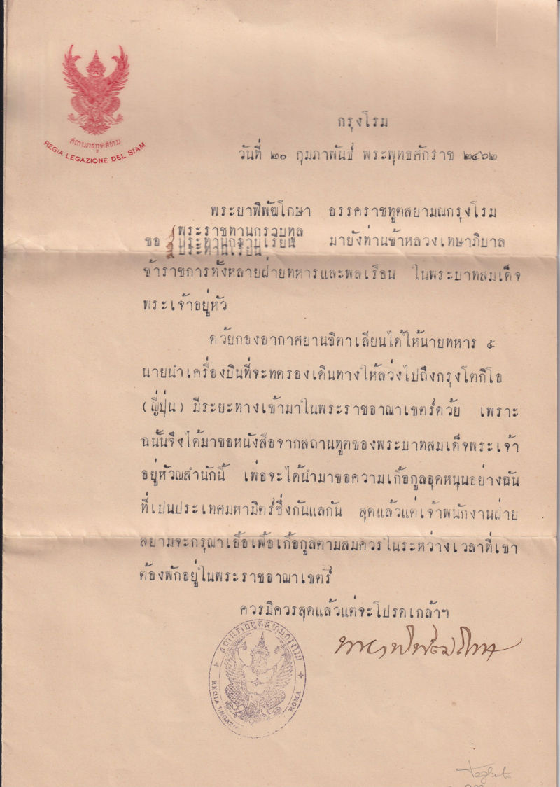 1920 RAID ROMA - TOKIO. Lettera di rappresentanza diplomatica della Regia Legazione del Siam che serviva al riconoscimento ed assistenza del pilota Cap. Umberto Re. Volata e trasportata personalmente dal pilota durante