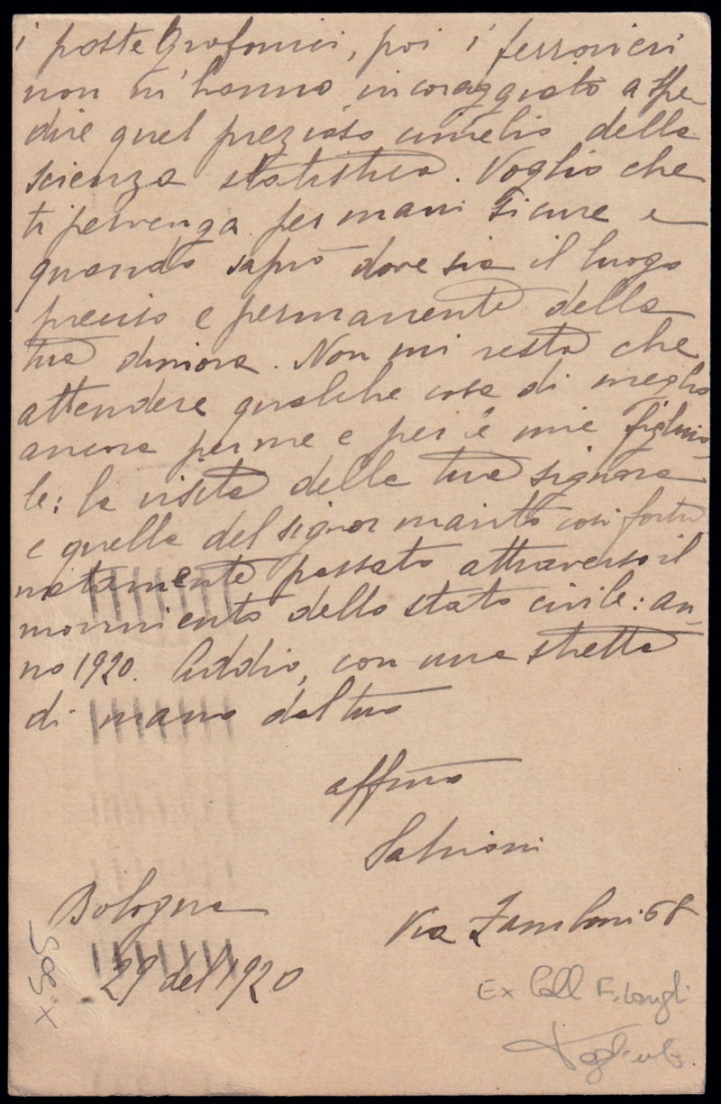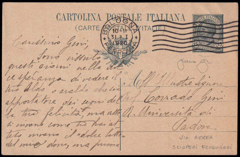 1920 SCIOPERI FERROVIARI / SERVIZI AEREI POSTALI DI EMERGENZA. Cartolina spedita da Bologna per Padova il 31/1/1920. Nel testo si accenna agli scioperi ferroviari. Longhi 1120. Riprodotto a pagina 188 del Catalogo