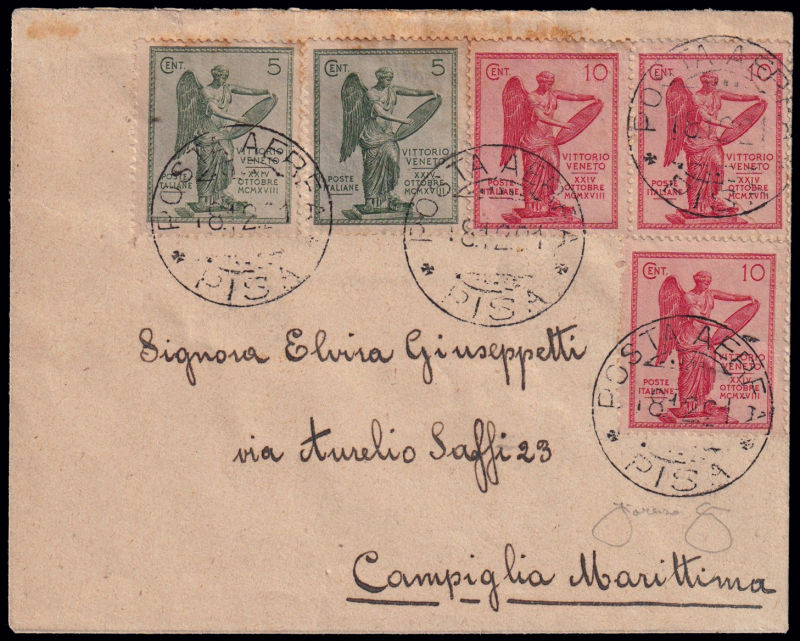 1921 PISA - CAMPIGLIA MARITTIMA VOLO SPERIMENTALE. Aerogramma affrancato con 5 francobolli annullati col timbro "Posta Aerea * PISA * 18.11.21" ed al retro timbro di arrivo "Campiglia Marittima 19.11.21". Firma di