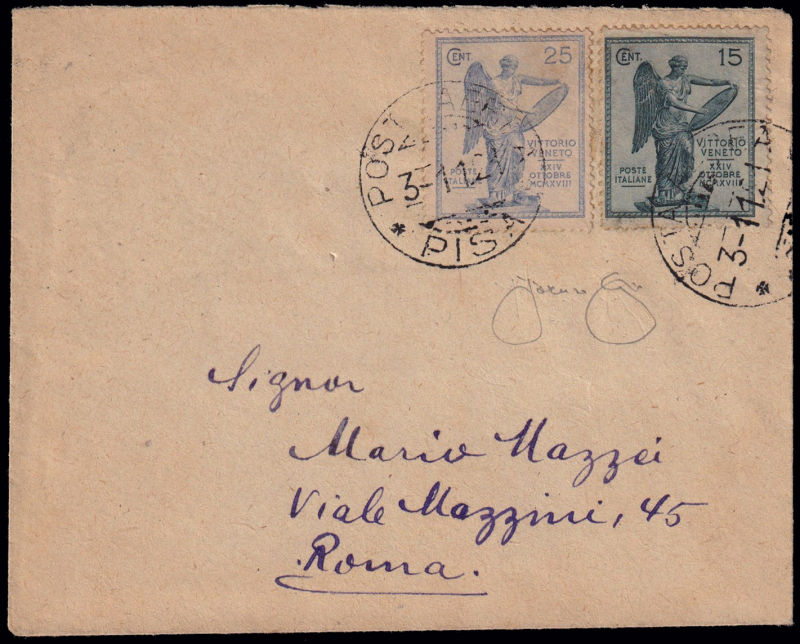 1921 PISA - ROMA VOLO SPERIMENTALE. Busta affrancata con due francobolli annullati col timbro "POSTA AEREA - PISA 3.11.21". Firma di garanzia F. Longhi. Riprodotta a pag. 212 del Catalogo "Aerofilia Italiana" di F.