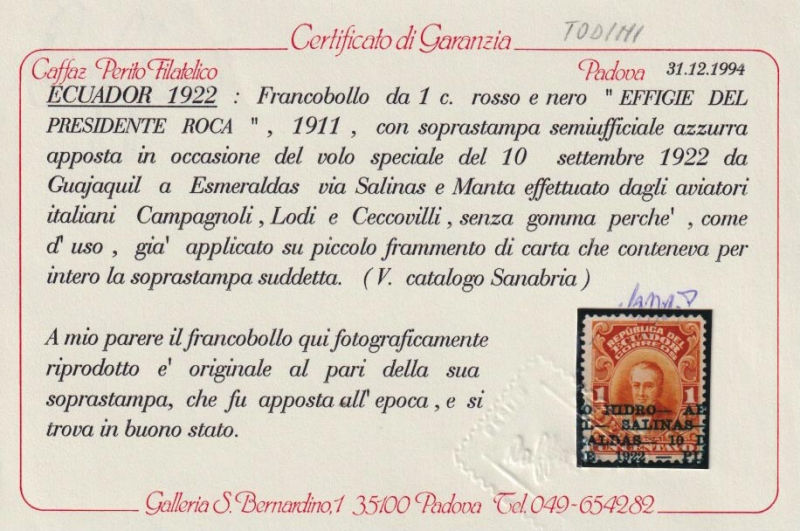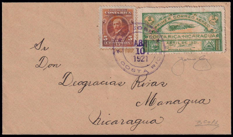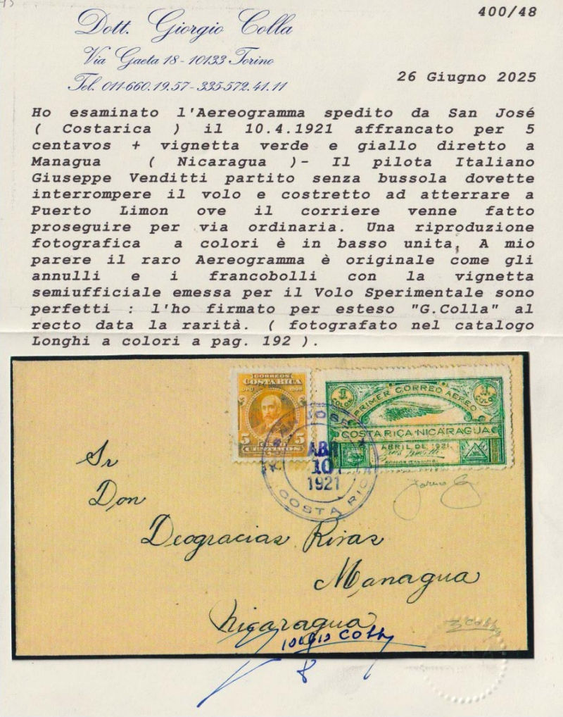 ABR 10 1921 / COSTA RICA". Il pilota partito senza bussola dovette atterrare a Puerto Limon da dove il corriere postale venne fatto proseguire per via di superficie. Longhi 1181. Firma di garanzia F. Longhi. Riprodotta a pag. 192 del Catalogo