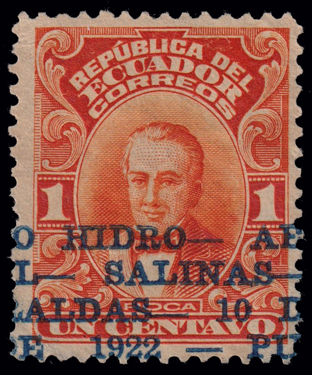 1922 GUAYAQUIL - SALINAS - MANTA - ESMERALDAS / CAMPAGNOLI. Francobollo da 1 centavos annullato col timbro speciale (CORRE)O HIDRO - AE(REO GUA)/(YAQUI)L - SALINAS - (MANTA)/(ESMER)ALDAS - 10 D(E SEPTIEM.)/ (BR)E 1922 -