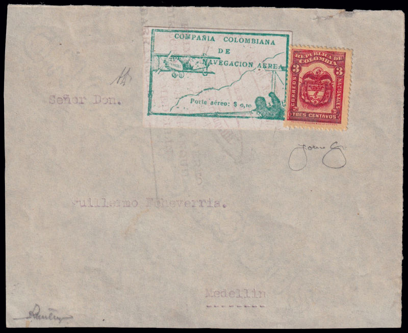 1922 GUICCIARDI PRIMO VOLO BARRANQUILLA - MEDELLIN. Soprascritta di aerogramma affrancato con un francobollo da 3 cents e un francobollo della "Compania Colombiana de Navegacion Aerea" della II emissione verde (Yv.