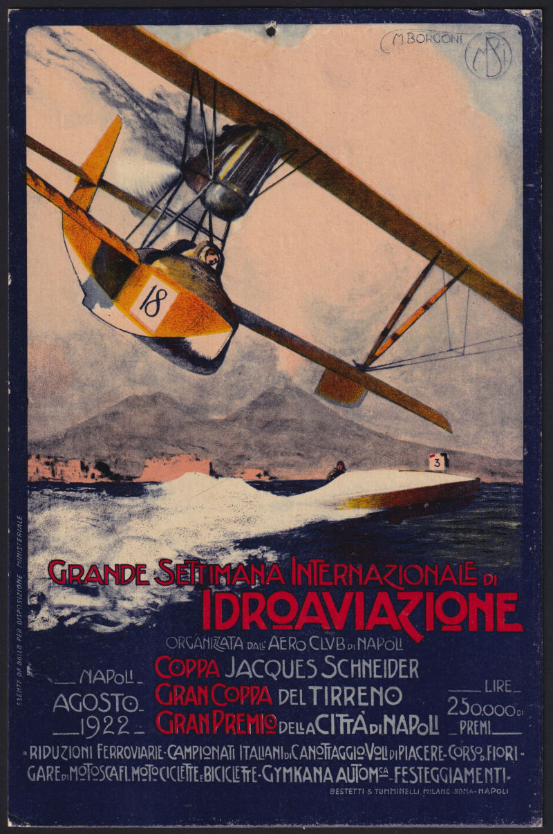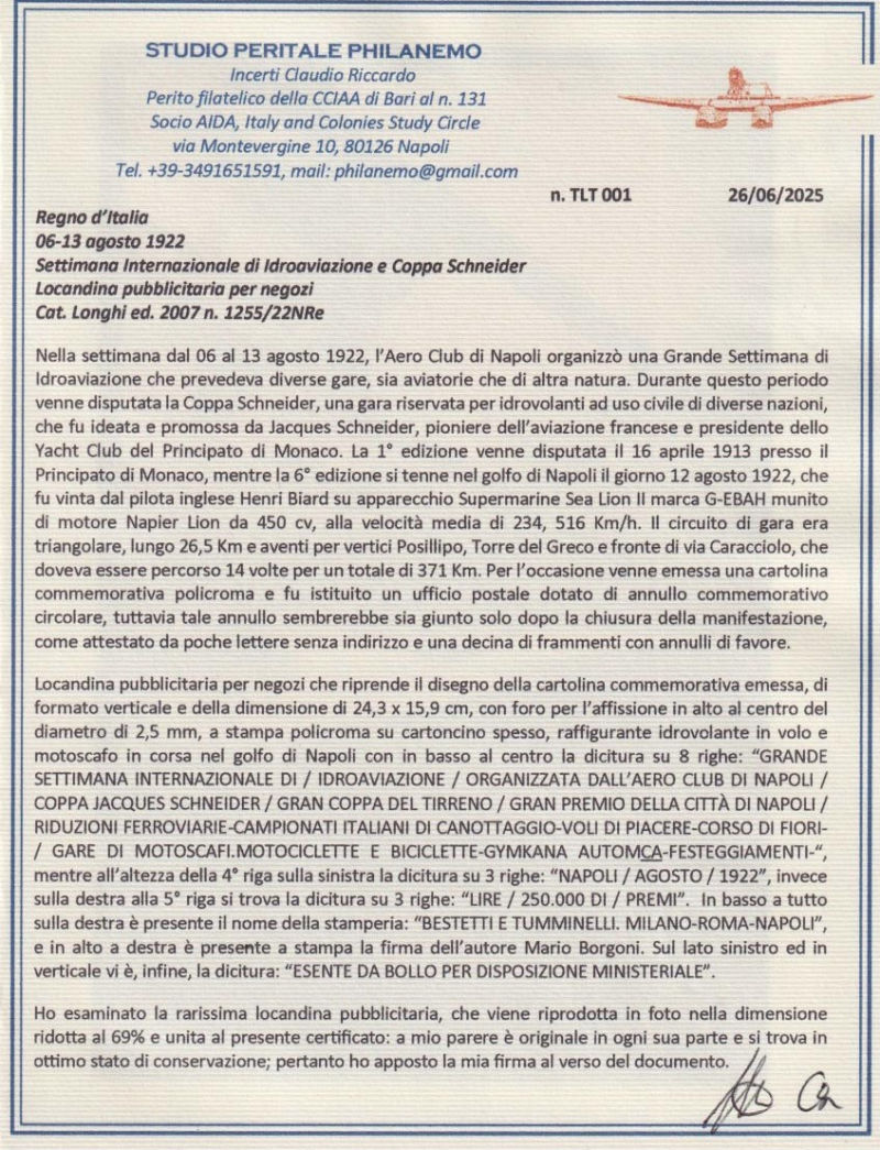 1922 NAPOLI SETTIMANA INTERNAZIONALE DI IDROAVIAZIONE. Locandina pubblicitaria per negozi (misure 24cmx16cm). Longhi 1255. Molto rara. Dettagliato certificato Philanemo (2025). (Image) (ImageA)