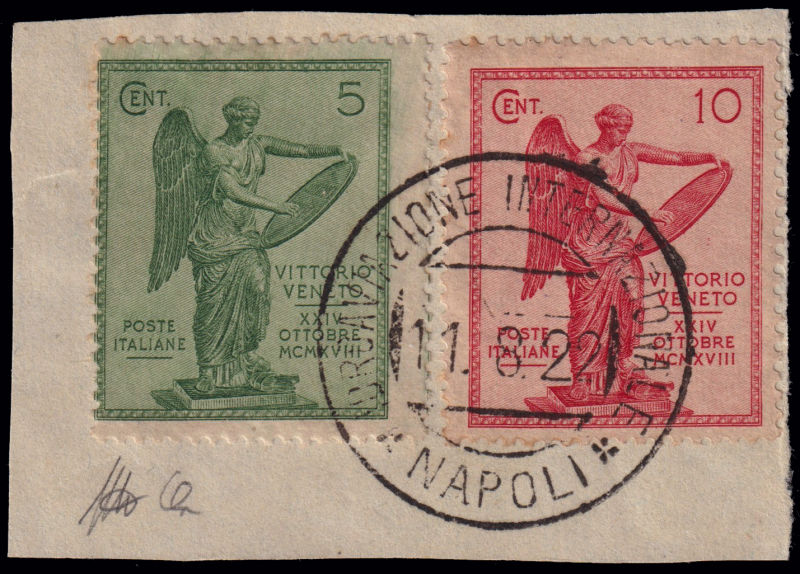 1922 NAPOLI SETTIMANA INTERNAZIONALE DI IDROAVIAZIONE. Frammento affrancato con due francobolli del Regno d'Italia annullati con il timbro speciale della manifestazione in data 11.8.22. Longhi 1251. Riprodotta a pag.