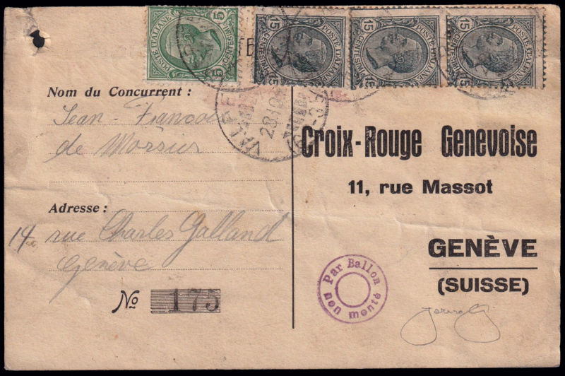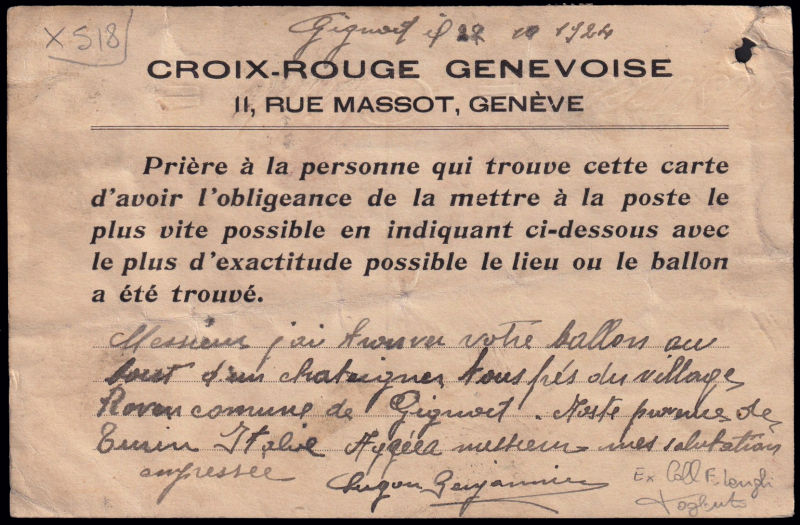 1924 GINEVRA - ITALIA / TRASPORTO POSTALE CON PALLONCINI. Cartolina prestampata della Croce Rossa ritrovata nel comune di Gignod (Aosta) e rispedita a Ginevra con affrancatura italiana per complessivi 50 centesimi. A