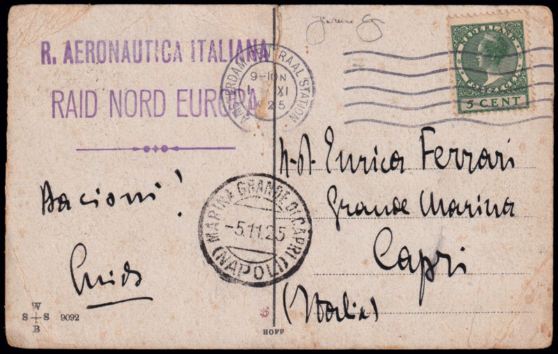 1925 CROCIERA AERONAUTICA ITALIANA DEL NORD EUROPA. Cartolina spedita da Amsterdam il 1/11/1925 per Capri (timbro di arrivo), a lato bollo su due righe "R.AERONAUTICA ITALIANA / RAID NORD EUROPA". Longhi 1394. Firma di