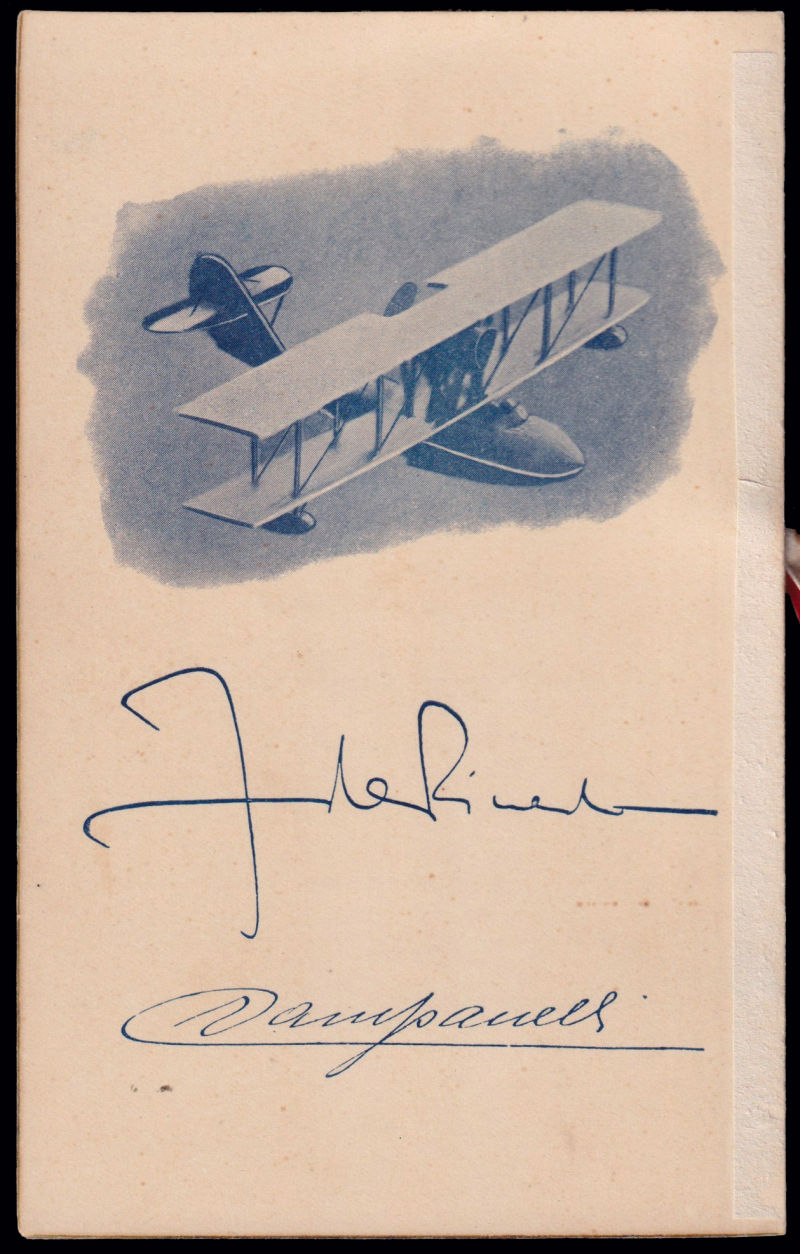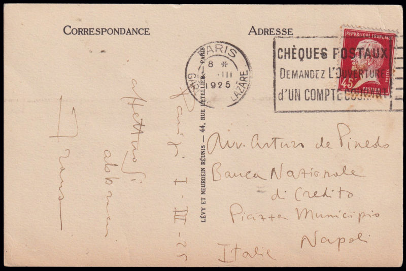 1925 RAID SESTO CALENDE - AUSTRALIA - FILIPPINE - CINA - GIAPPONE - ROMA / DE PINEDO. Cartolina spedita il 2 marzo 1925 da Parigi al fratello Arturo De Pinedo a Napoli poche settimane prima di iniziare il viaggio.