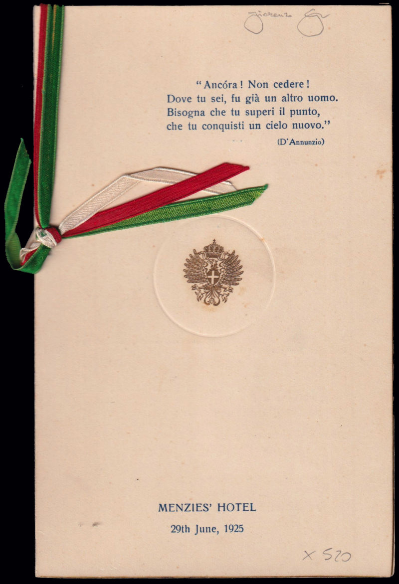 1925 RAID SESTO CALENDE - AUSTRALIA - FILIPPINE - CINA - GIAPPONE - ROMA / DE PINEDO. Menù tricolore del pranzo presso l'Hotel Menzies di Melbourne datato 29 giugno 1925 con al retro le firme di De Pinedo e Campanelli