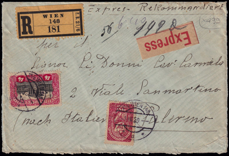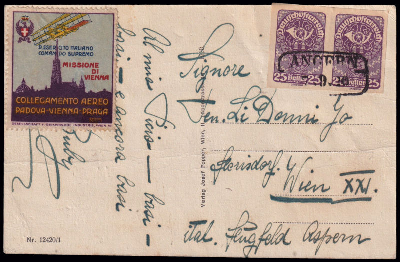 1919 VIENNA - PADOVA COLLEGAMENTO POSTALE AEREO. Lotto di una lettera ed una cartolina dello stesso archivio rispettivamente spedite a Palermo e Vienna con vignetta uffiziale policroma "Missione di Vienna". Longhi