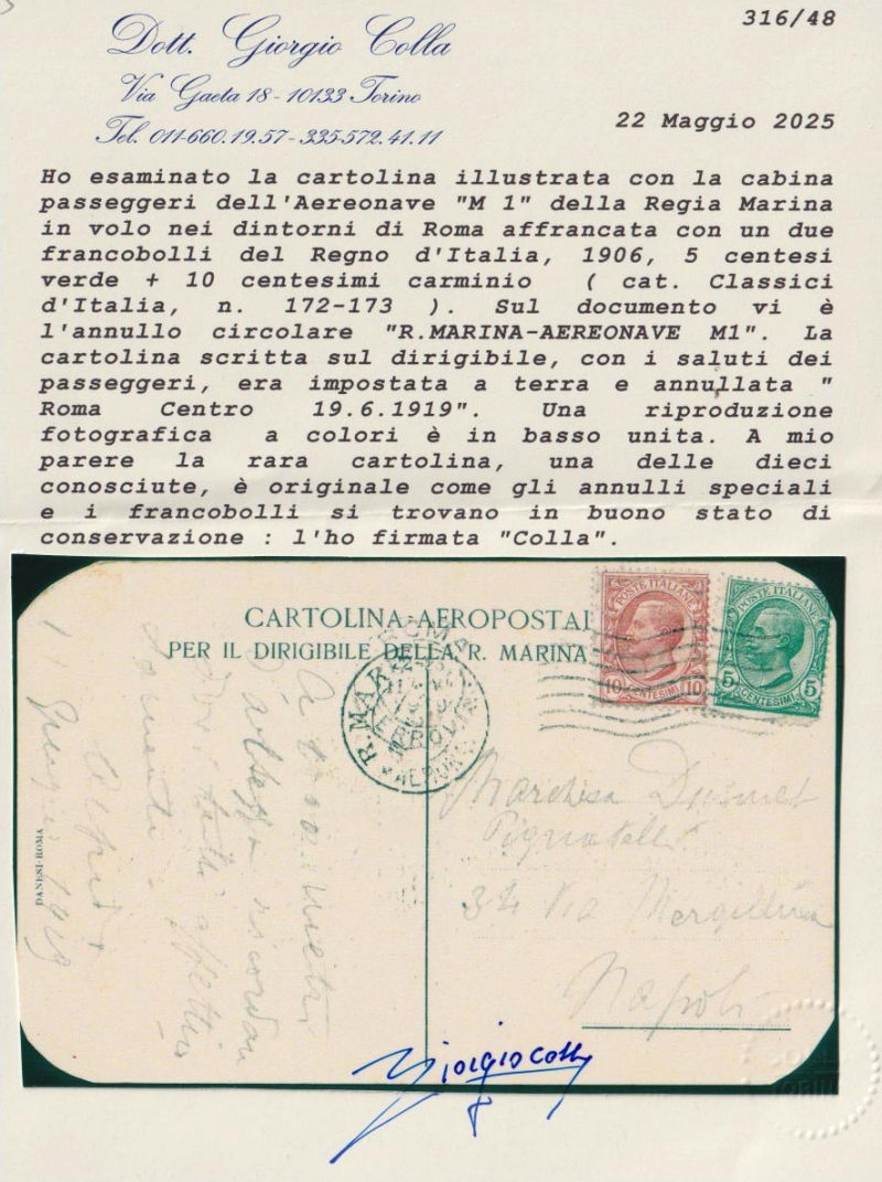 11/6/1919. A lato timbro speciale "R.MARINA - AERONAVE M1". Longhi 1043. Dettagliato certificato Colla (2025). Una delle sole dieci cartoline affrancate note.