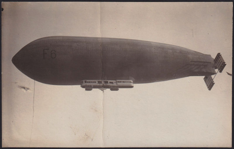 1920 DIRIGIBILE F.6 / VOLO MILANO - COMO. Cartolina fotografica del dirigibile in volo (carta fotografica UBERMOR) con timbro lineare violetto a linee ondulate ed al centro su due righe "POSTA AEREA / DIRIGIBILE F.6" e