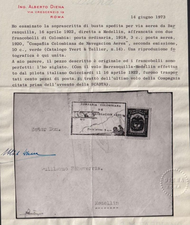 n.14) annullati con i timbri speciali "Primer Correo Aereo Directo de Barranquilla a Medellin / Barranquilla". Longhi 1221. Firma di garanzia F. Longhi e dettagliato certificato "storico" A. Diena (1973). (Image) (ImageA)