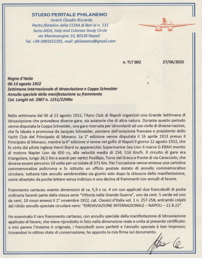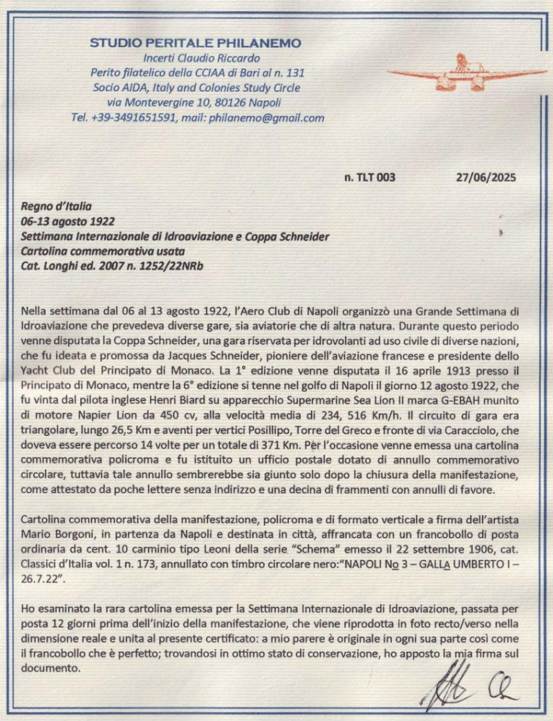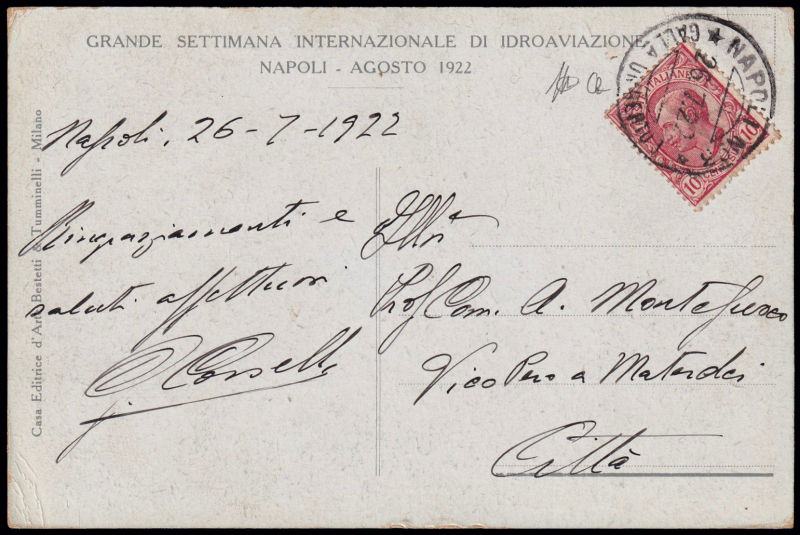1922 NAPOLI SETTIMANA INTERNAZIONALE DI IDROAVIAZIONE. Cartolina commemorativa verticale spedita da Napoli per città il 26/7/22. Longhi 1252. Dettagliato certificato peritale Philanemo (2025). (Image) (ImageA)