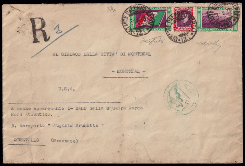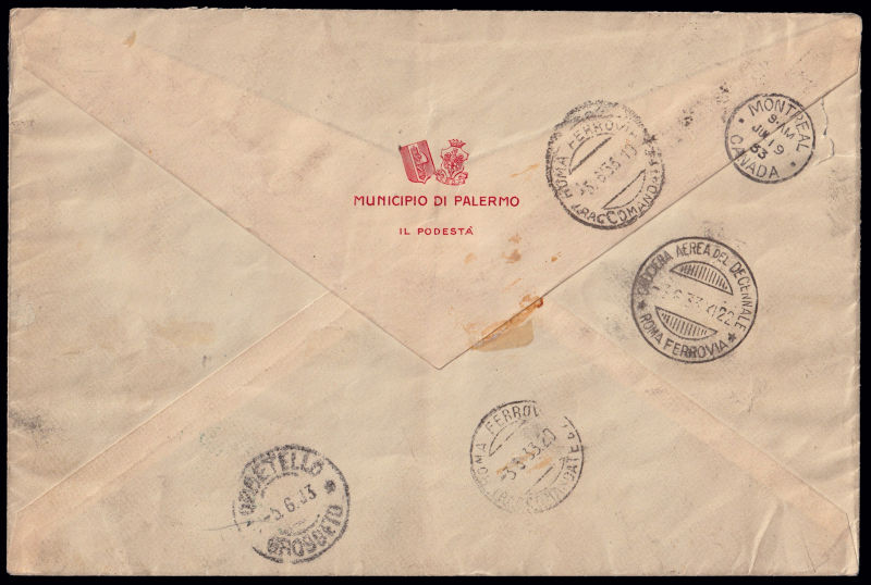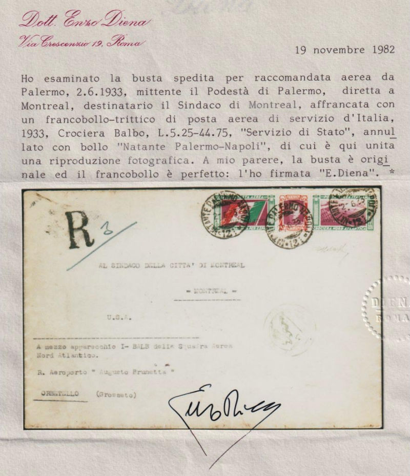 221 L image1933 CROCIERA AEREA DEL DECENNALE. Servizio di Stato fra Sindaci. Aerogramma spedito da Palermo per Montreal affrancato con il trittico da 50 lire soprastampato Servizio di Stato annullato eccezionalmente con il timbro del "natante Palermo Napoli" in data 2/6/33. Trasportato dall'apparecchio I-BALB del Comandante Italo Balbo reca il bollo speciale verde della Crociera e i timbri di transito e arrivo in data 19/7/33. Firma di garanzia Giulio Bolaffi e dettagliato certificato "storico" E. Diena (1982). Massima rarità della collezione. (Image) (ImageA) (ImageB)