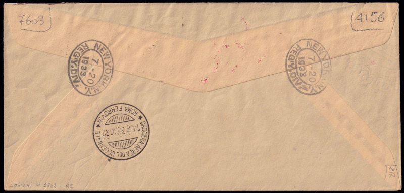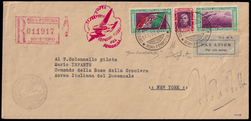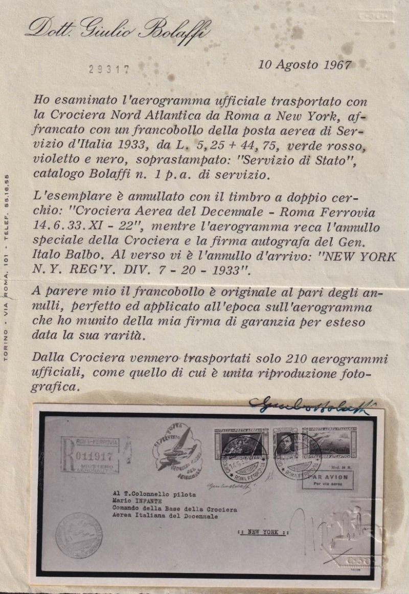 222 L image1933 CROCIERA AEREA DEL DECENNALE. Servizio di Stato. Aerogramma affrancato col trittico da 50 lire soprastampato annullato con il cachet speciale e diretto a New York. Timbro rosso di raccomandazione e aereo stilizzato. Reca la firma autografa del Comandante Italo Balbo. Timbro speciale color nerastro e bolli di transito e arrivo al retro. Firma di garanzia G. Bolaffi e dettagliato certificato "storico" (1967). (Image) (ImageA) (ImageB)