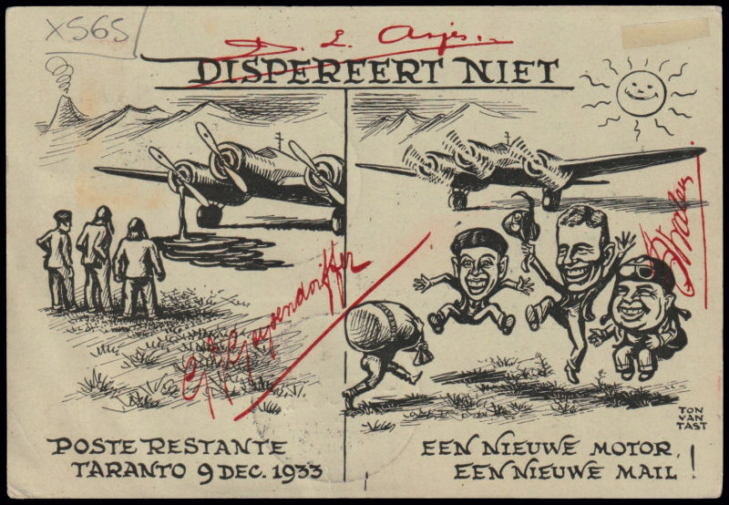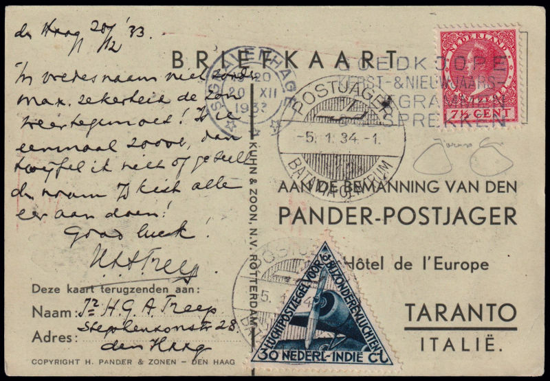224 L image1934 AMSTERDAM - ROMA - (BRINDISI) - (BATAVIA) / VOLO INTERROTTO A GROTTAGLIE. Cartolina trasportata dai piloti nel volo di andata a Batavia ed in quello di ritorno in Olanda, affrancata con francobolli di Olanda annullati col bollo meccanico "GRAVENHAGE 1934 11.1.13" e "Postjager - Batavia Centrum - 5.1.34". Longhi 3060. Riprodotta a pag. 466 del Catalogo "Aerofilia Italiana" di F. Longhi. Firma di garanzia F. Longhi. (Image) (ImageA)