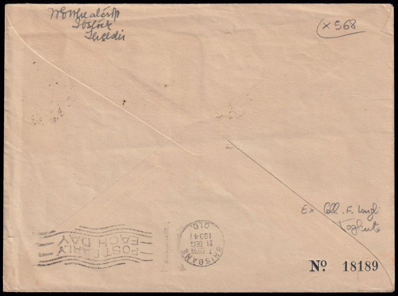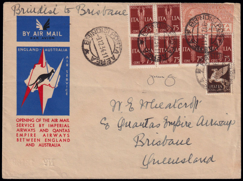 225 L image1934 BRINDISI - KARACHI - MELBOURNE. Dispaccio Brindisi - Brisbaine. Aerogramma affrancato con 8 francobolli del Regno d'Italia annullati il 9/12/34 diretto a Brisbaine (timbro di arrivo 21.12.34). Longhi 3229. Riprodotta a pag. 980 del Catalogo "Aerofilia Italiana" di F. Longhi, nuova edizione. Firma di garanzia F. Longhi. (Image) (ImageA)