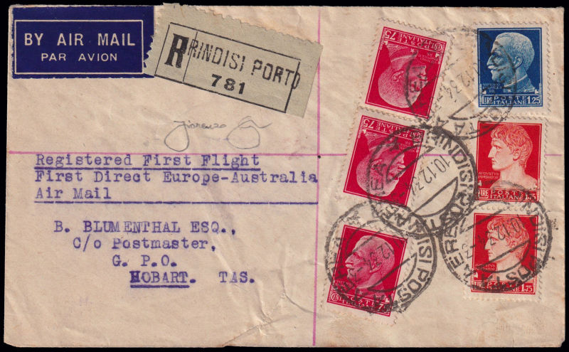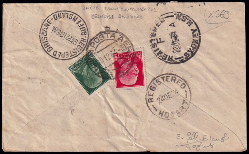 226 L image1934 BRINDISI - KARACHI - MELBOURNE. Dispaccio Brindisi - Hobart. Aerogramma affrancato con 6 francobolli della serie Imperiale annullati in data 10.12.34 e diretto a Hobart. Timbri di transito a Brisbaine (21DE34), Sidney (22DE34) e arrivo a hobart in data 24DE34. Longhi 3229 nota. Riprodotta a pag. 980 del Catalogo "Aerofilia Italiana" di F. Longhi, nuova edizione. Firma di garanzia F. Longhi. Rarissimo. (Image) (ImageA)