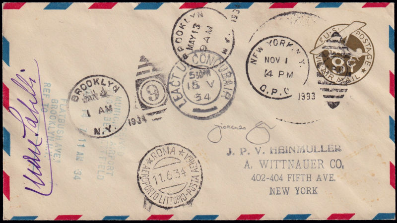 227 L image1934 NEW YORK - ROMA / VOLO SPECIALE / VOLO INTERROTTO IN IRLANDA. Aerogramma con firma del pilota Sabelli in viola con diversi timbri di partenza, transito e arrivo fra cui l'irlandese "LEACT UI COCUBAIR 530 PM - 15 V - 34" e "Roma Aeroporto Littorio - Posta Aerea 11.6.34". Longhi 3112. Firma di garanzia F. Longhi. (Image) (ImageA)