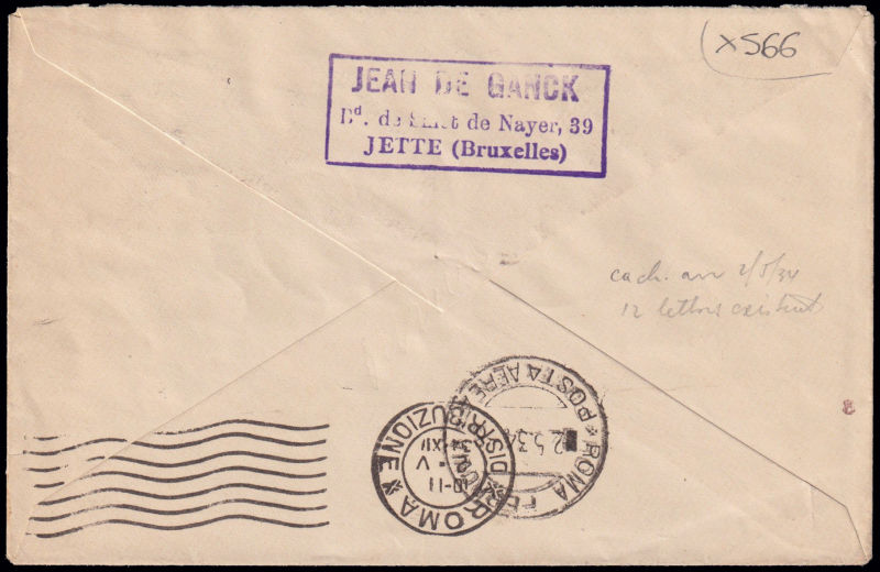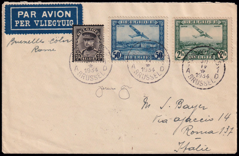 228 L image1934 VOLO ROMA - GENOVA - MARSIGLIA - BRUXELLES - AMSTERDAM - LONDRA / VOLO DI RITORNO. Aerogramma affrancato con 3 francobolli del Belgio annullati "Brussel 30.IV.1934" e diretto a Roma (timbro di arrivo al retro. Longhi 3096a (nuova numerazione). Riprodotta a pag. 940 del Catalogo "Aerofilia Italiana" di F. Longhi, nuova edizione. Firma di garanzia F. Longhi. Dispaccio di soli 12 aerogrammi. (Image) (ImageA)