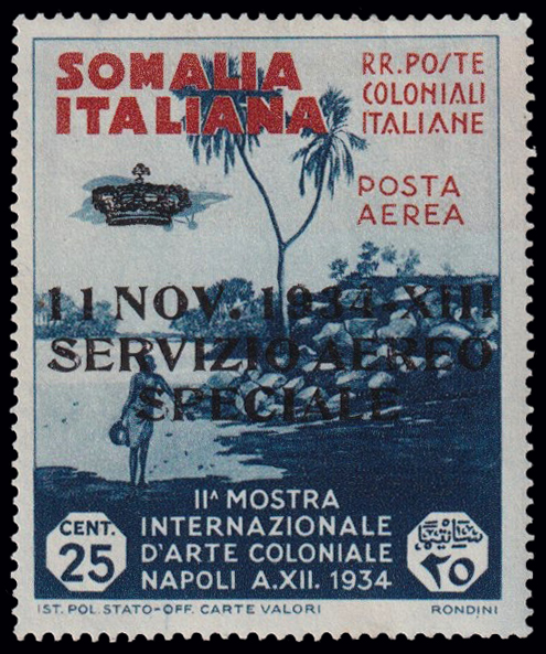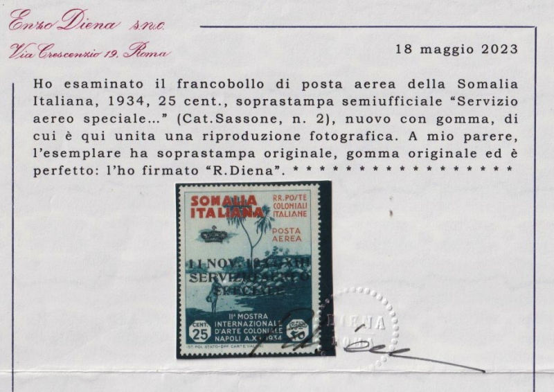 229 Z image1934 VOLO ROMA - MOGADISCIO. SERVIZIO AEREO si Somalia da 25 centesimi con soprastampa 1934 e coroncina (Sassone 2), nuovo con traccia di linguella. Firma di garanzia G. Bolaffi e certificato Diena. (Image) (ImageA) (ImageB)