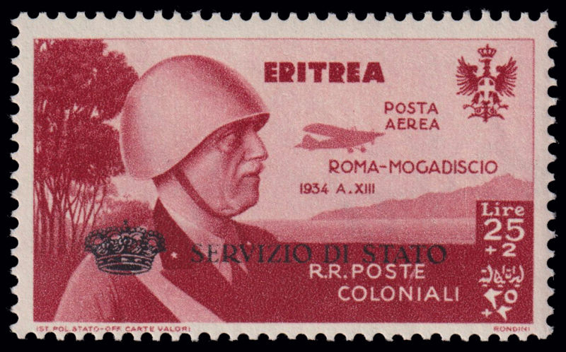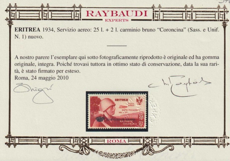 230 G image1934 VOLO ROMA - MOGADISCIO. Francobollo di Eritrea da 25 lire + 2 lire carminio bruno con soprastampa SERVIZIO DI STATO E "Coroncina", nuovo con gomma integra. Dettagliato certificato "oro" Raybaudi (2010). (Image) (ImageA) (ImageB)