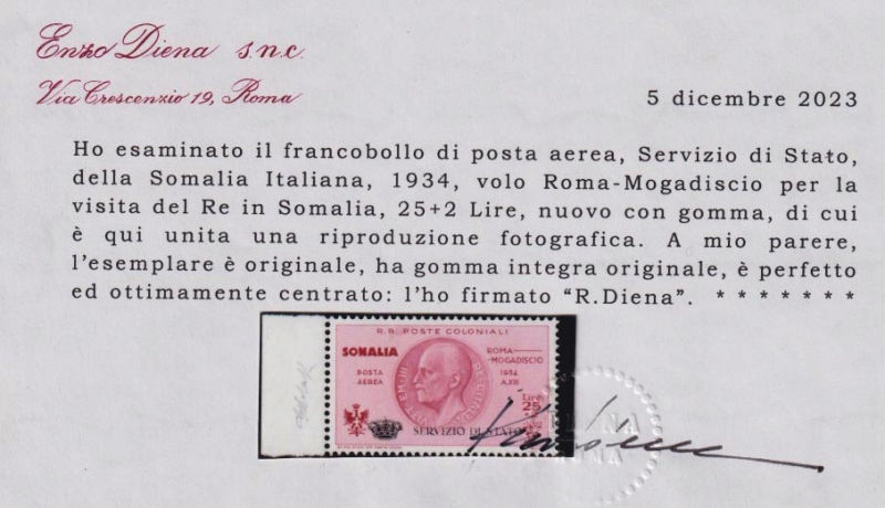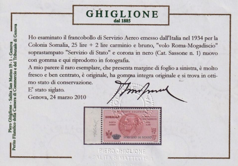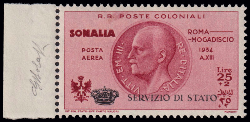 231 G image1934 VOLO ROMA - MOGADISCIO. Francobollo di Somalia da 25 lire + 2 lire carminio bruno con soprastampa SERVIZIO DI STATO E "Coroncina", nuovo con gomma integra, bordo di foglio laterale. Dettagliati certificati Diena (2010) e Ghiglione e firma di garanzia G. Bolaffi. (Image) (ImageA) (ImageB) (ImageC)