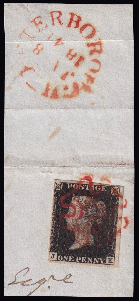 232 F imageQUEEN VICTORIA 1d.. Plate 1B, letters JK, used on piece with red Maltese cross cancellation and red circle "Peterborough" cds. Four good wide margins. (Image)