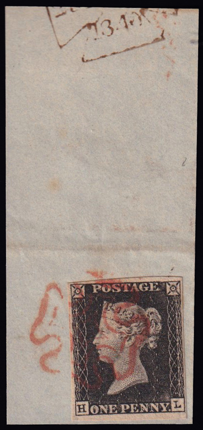 233 F imageQUEEN VICTORIA 1d.. Plate 1a, letters HL, used on piece with red Maltese cross cancellation. Four wide margins. Very fine. (Image)
