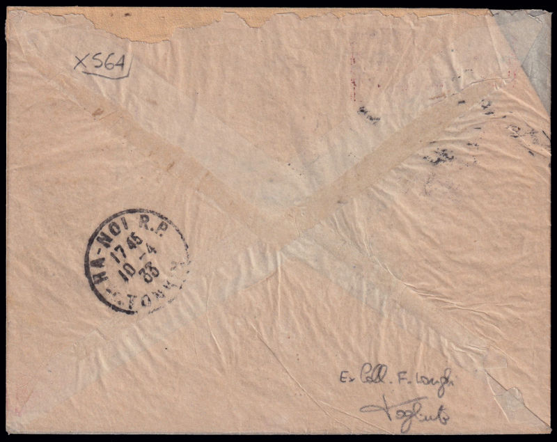 223 L image1933 INDOCINA MARSIGLIA / VOLO INTERROTTO. Corriere dall'Indocina. Aerogramma raccomandato affrancato con 3 francobolli di Indocina annullati "Tong / Tonkin 10 - 4 33". Timbro al retro "Ha Noi Tonkin 10.4.33". Longhi 2809. Riprodotta a pag. 434 del Catalogo "Aerofilia Italiana" di F. Longhi. Firma di garanzia F. Longhi. (Image) (ImageA)