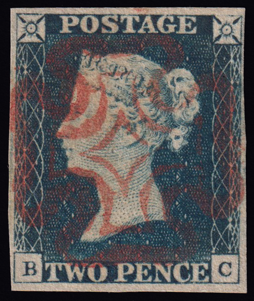 243 U imageQUEEN VICTORIA 2d.. Letters BC, used with well centred red Maltese cross cancellation. Four wide margins. Superb. (Image) (ImageA)