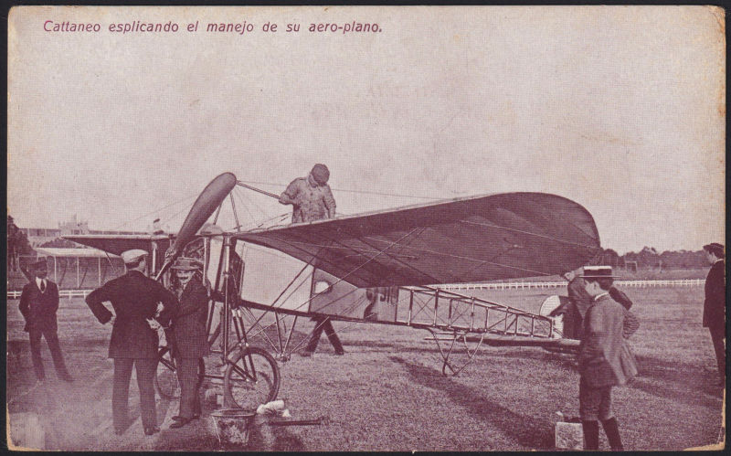 1910 COLONIA - BUENOS AIRES - BARTOLOMEO CATTANEO. Cartolina orizzontale "Cattaneo esplicando el manejo de su aero-plano". Nuova. Longhi 403. Molto rara. (Image) (ImageA)
