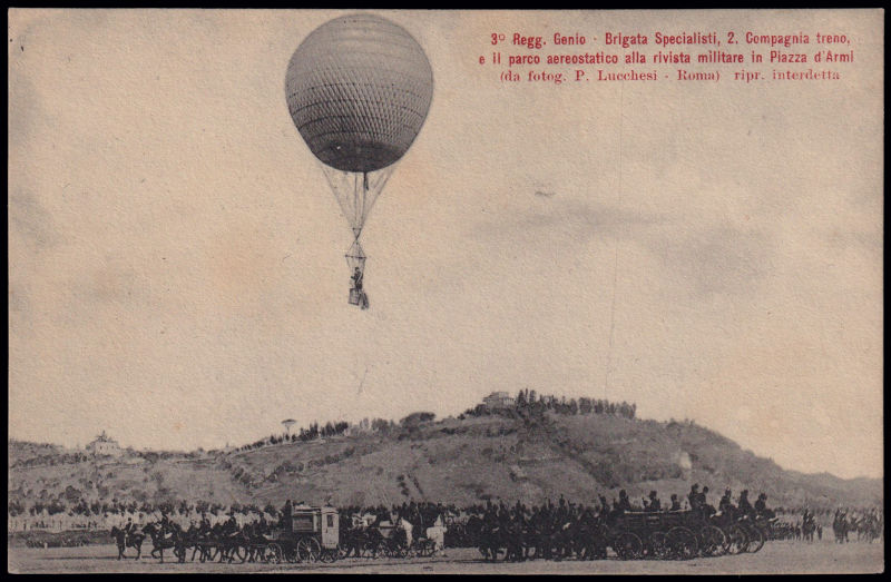 1904 ROMA - ASCENSIONE LIBERA IN PALLONE. Cartolina a stampa "3° Regg. Genio Brigata Specialisti" Da fotog. P. Lucchesi. Nuova. Riprodotta a pag. 29 della nuova edizione del Catalogo "Aerofilia Italiana". Ex Asta P.