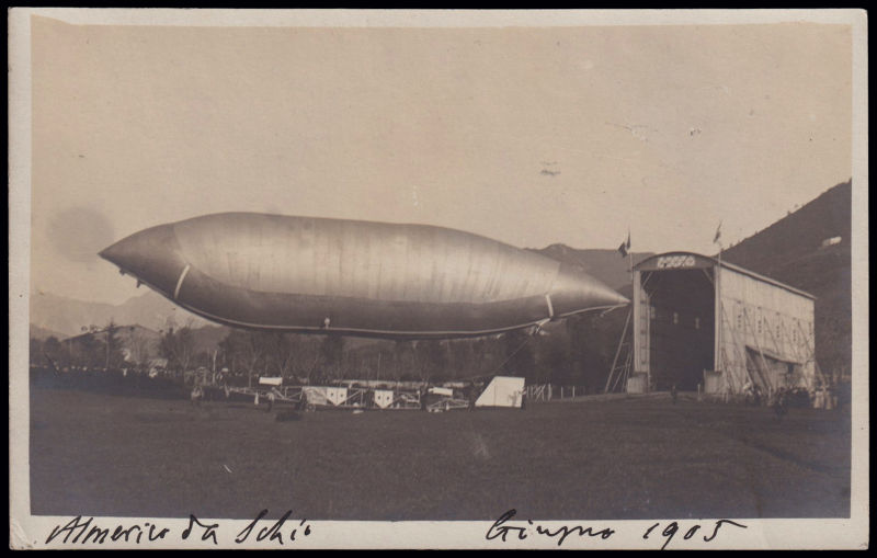 1905 - SCHIO / VOLI DI PROVA DELL'AERONAVE ITALIA. Cartolina fotografica delDirigibile (Tensi), nuova. Riprodotta a pag. 33 della nuova edizione del Catalogo "Aerofilia Italiana". Firmata F. Longhi. Longhi 56. (Image) (ImageA)