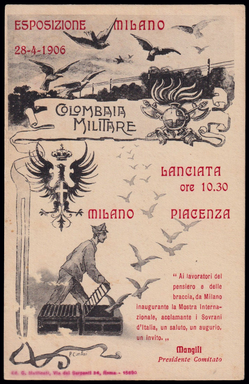 1906 ESPOSIZIONE DI MILANO - COLOMBAIA MILITARE. Cartolina verticale con sovrastampa in rosso del lancio MILANO - PIACENZA. Nuova. Longhi 86.