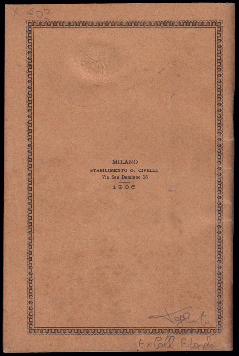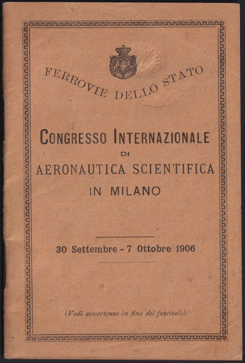 1906 MILANO - CONGRESSO INTERNAZIONALE DI AERONAUTICA SCIENTIFICA. Libretto delle Ferrovie dello Stato per il Congresso. con 20 scontrini a tariffa differenziata. All'interno della copertina timbro figurato viola con