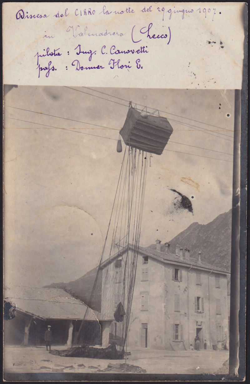 1907 MILANO / CONCORSO DI LUNGA DISTANZA PER PALLONI LIBERI. Cartolina fotografica del pallone "Cirro" incastrato fra i cavi della teleferica, spedita da E. Donner Fiori a Nino Piccoli il 2/4/1907. Unica cartolina nota.