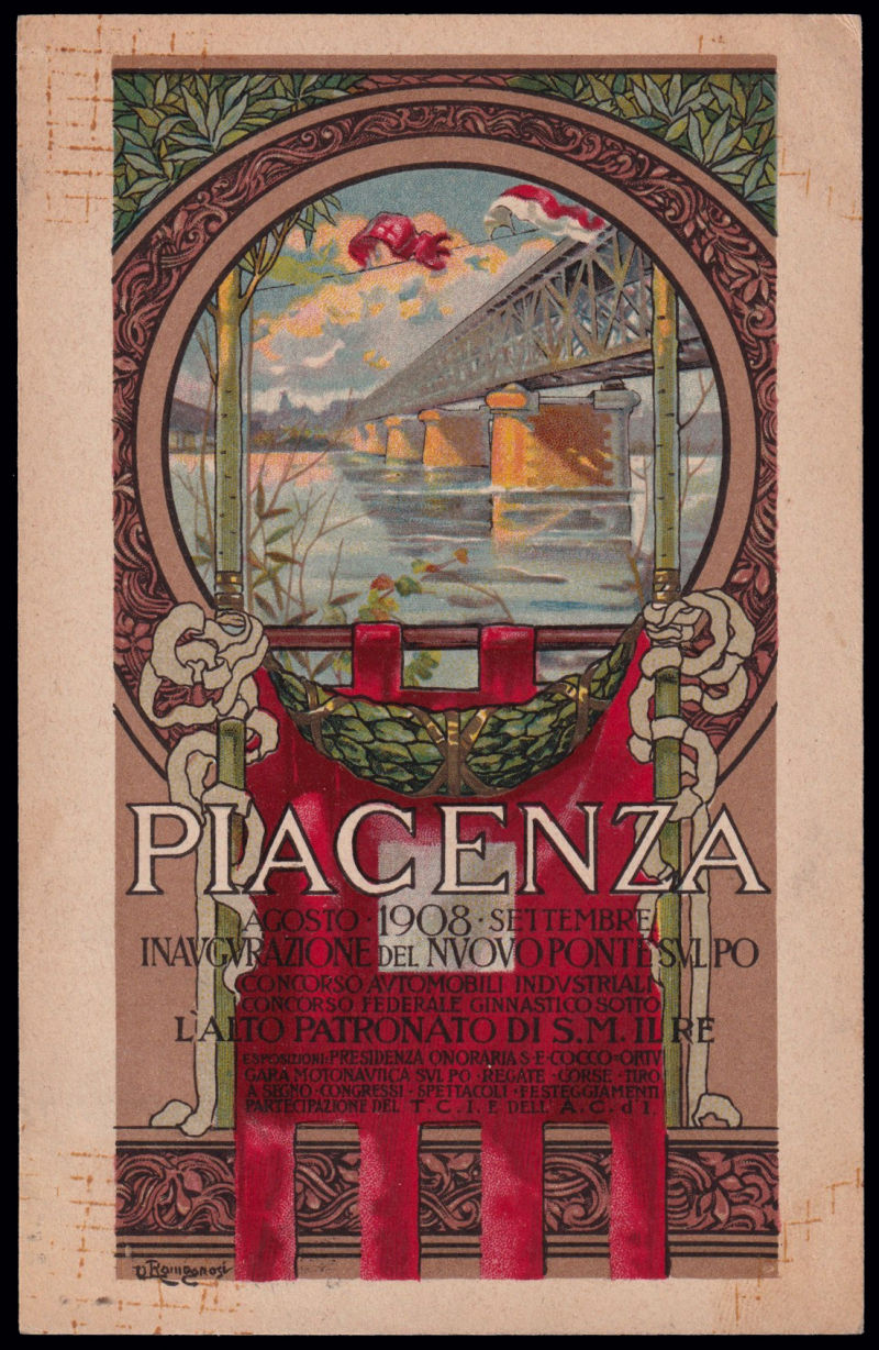 1908 PIACENZA ASCENSIONI AEROSTATICHE. Cartolina policroma verticale dell'inaugurazione del ponte sul Po. Viaggiata. Longhi 139.