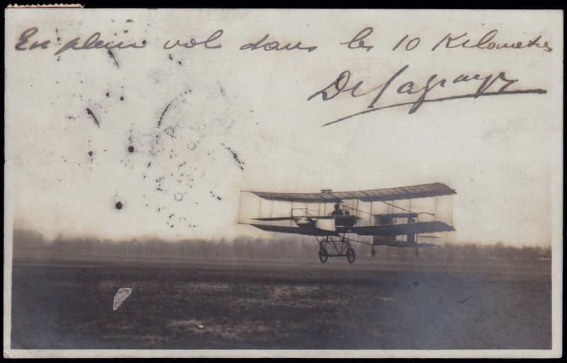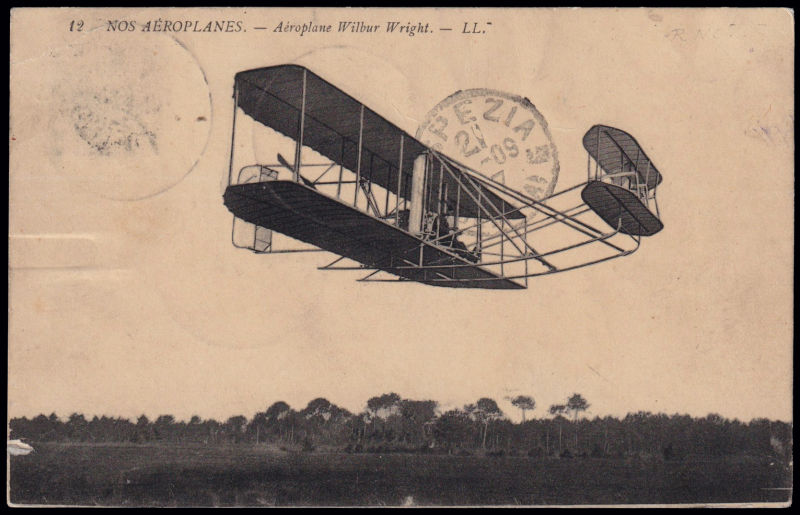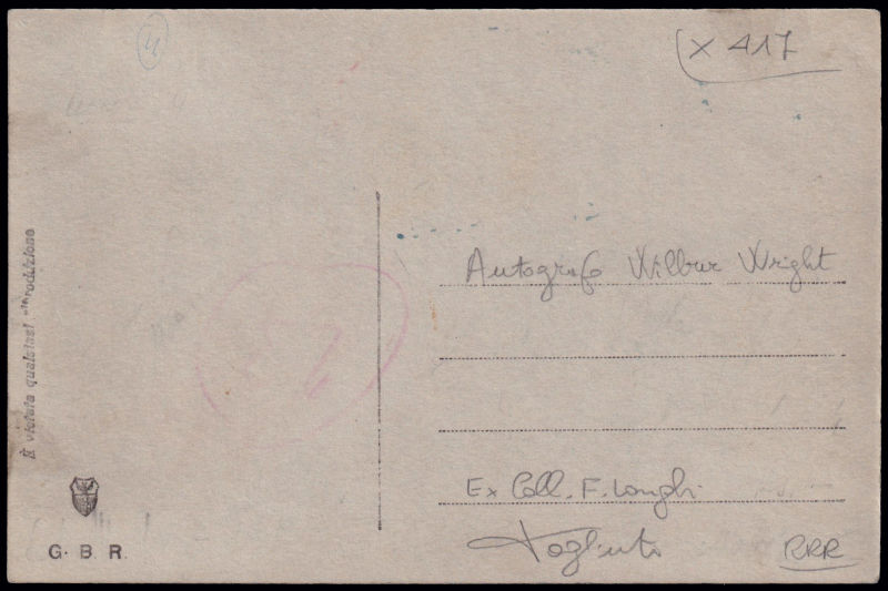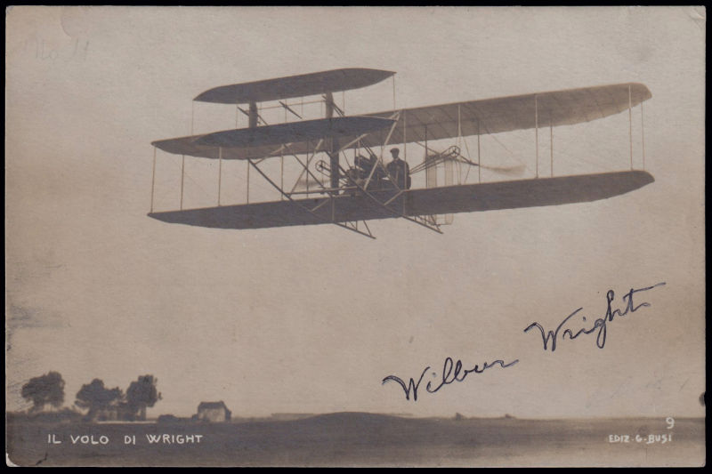 1909 VOLI DI WILBUR WRIGHT A CENTOCELLE. Cartolina fotografica dell'aereo in volo (9 - Edit G. Busi), con autografo originale in inchiostro blu. Riprodotta a colori a pag. 104 del Catalogo "Aerofilia Italiana". Longhi